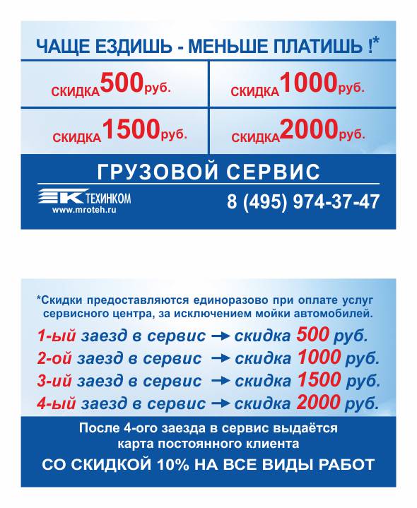 Для участия в акции, пожалуйста, скачайте и распечатайте КУПОН НА СКИДКИ и предъявите при оплате услуг в грузовом сервисном центре ТЕХИНКОМ.