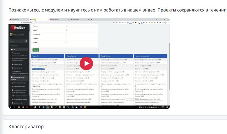 Платформа RedBox предлагает модули для развития и продвижения сайта. Здесь отличный блок с кластеризацией, когда можно подобрать уникальные ключевые слова и успешно продвигаться в поисковике без серьезных затрат. Я пользуюсь чаще всего модулем по анализу релевантности страниц сайта. Здесь можно посмотреть видео-инструкция, как изначально подготовить сайт к работе и что можно сделать, используя данный модуль. Спасибо команде разработчиков за такой необходимый ресурс!