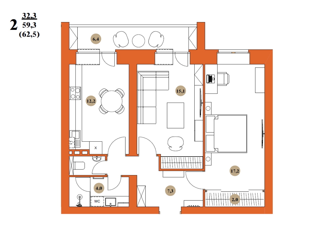 - лоджия площадью 6,4 м² — для организации летней лаунж-зоны;