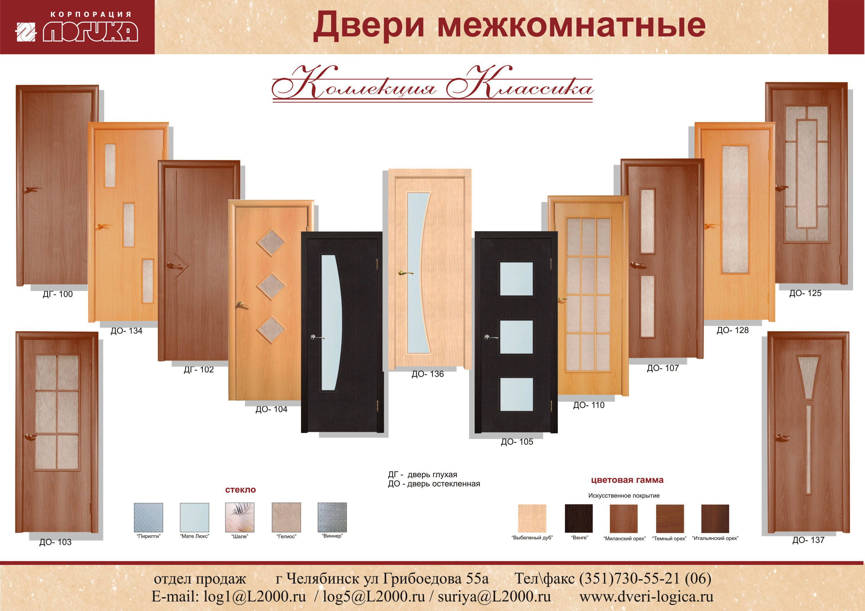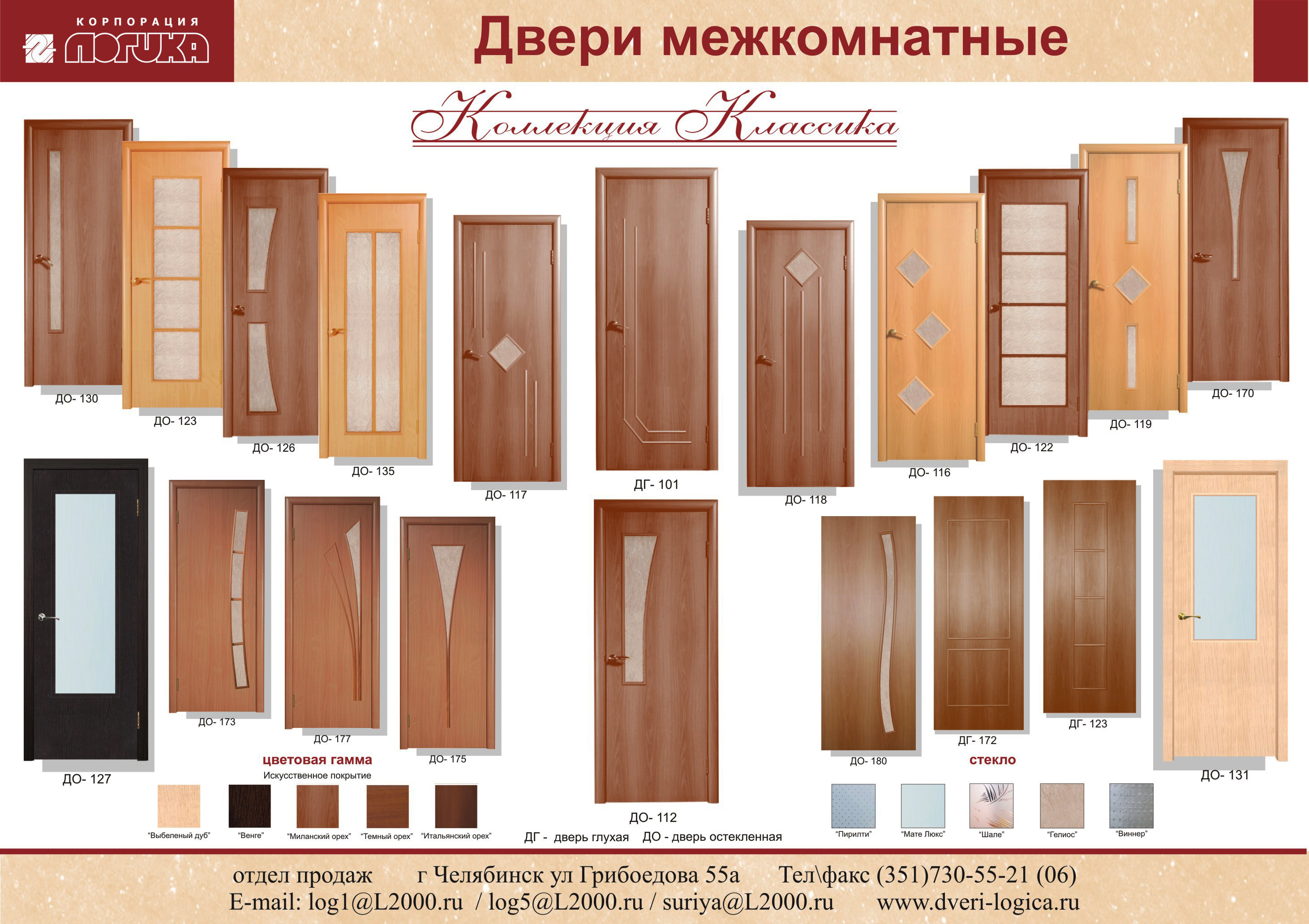 Добрый день! Вас приветствует Корпорация "Логика", Челябинск. Возможно, Вас заинтересует наше предложение сотрудничества по поставке дверей межкомнатных. В прикрепленных файлах цены и модели полотен серии "Классика" Все вопросы мы можем подробно обсудить в удобное для Вас время по т.(351)730-55-21,730-55-06(отдел продаж), сот.8-905-831-79-87. -- С уважением,менеджер по работе с клиентами Жуйкова Галина Владимировна. т.8-905-831-79-87 mailto:log5@l2000.ru