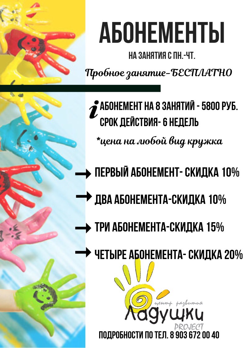 Для самых маленьких мы организовали клуб раннего развития, где малыши вместе с мамами начинают заниматься с 1 года и готовятся к детскому саду.