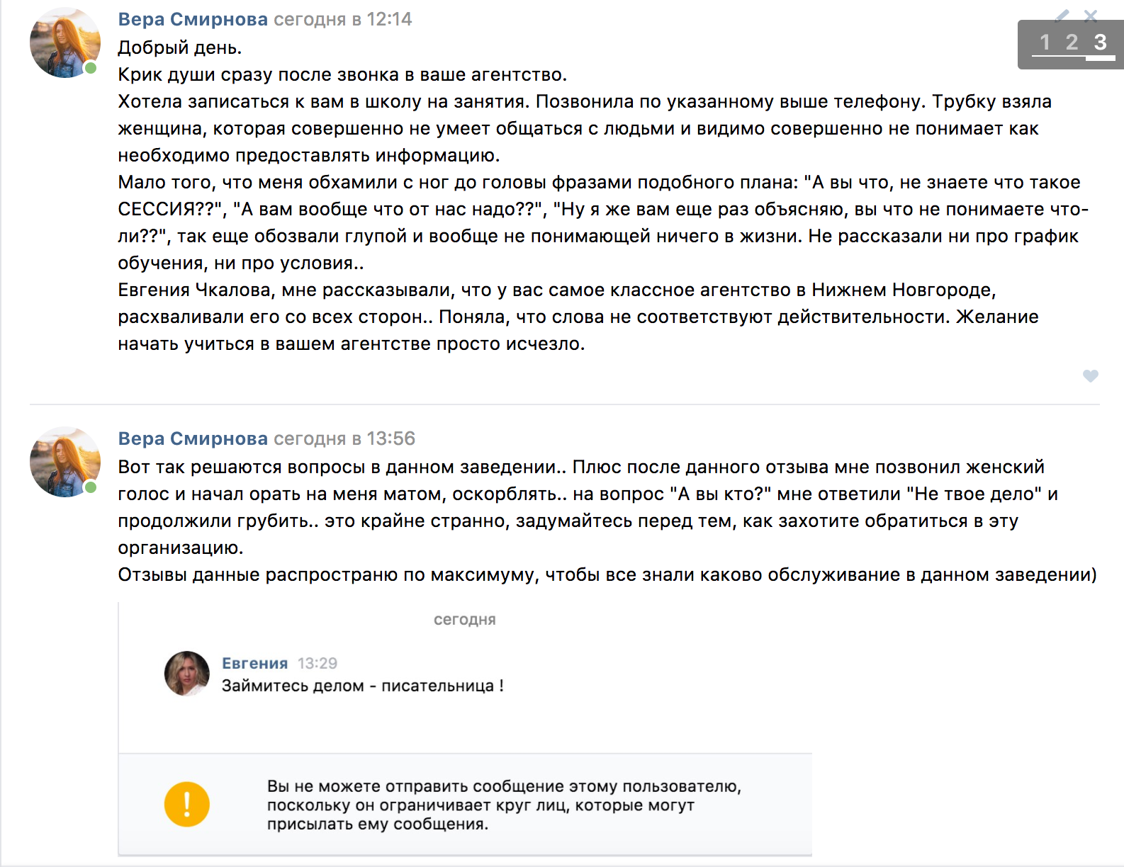 Оставила данный комментарий на сайте ВКонтакте, тк хотелось просто достучаться до организаторов этого заведения: Добрый день. Крик души сразу после звонка в ваше агентство. Хотела записаться к вам в школу на занятия. Позвонила по указанному выше телефону. Трубку взяла женщина, которая совершенно не умеет общаться с людьми и видимо совершенно не понимает как необходимо предоставлять информацию. Мало того, что меня обхамили с ног до головы фразами подобного плана: "А вы что, не знаете что такое СЕССИЯ??", "А вам вообще что от нас надо??", "Ну я же вам еще раз объясняю, вы что не понимаете что-ли??", так еще обозвали глупой и вообще не понимающей ничего в жизни. Не рассказали ни про график обучения, ни про условия.. Евгения Чкалова, мне рассказывали, что у вас самое классное агентство в Нижнем Новгороде, расхваливали его со всех сторон.. Поняла, что слова не соответствуют действительности. Желание начать учиться в вашем агентстве просто исчезло. После этого мне сначала приходит сообщение от самой Евгении Чкаловой "Займитесь делом - писательница", а следом за этим мне поступает телефонный звонок и женский голос с ходу начинае мне грубить, оскорблять даже не представившись и не разъяснив суть своего звонка. На вопрос "А вы кто?" мне ответили "Не твое дело" и продолжили грубить.. Вот так решаются вопросы в данном заведении.. это крайне странно, задумайтесь перед тем, как захотите обратиться в эту организацию, и тем более отдать туда своих детей.