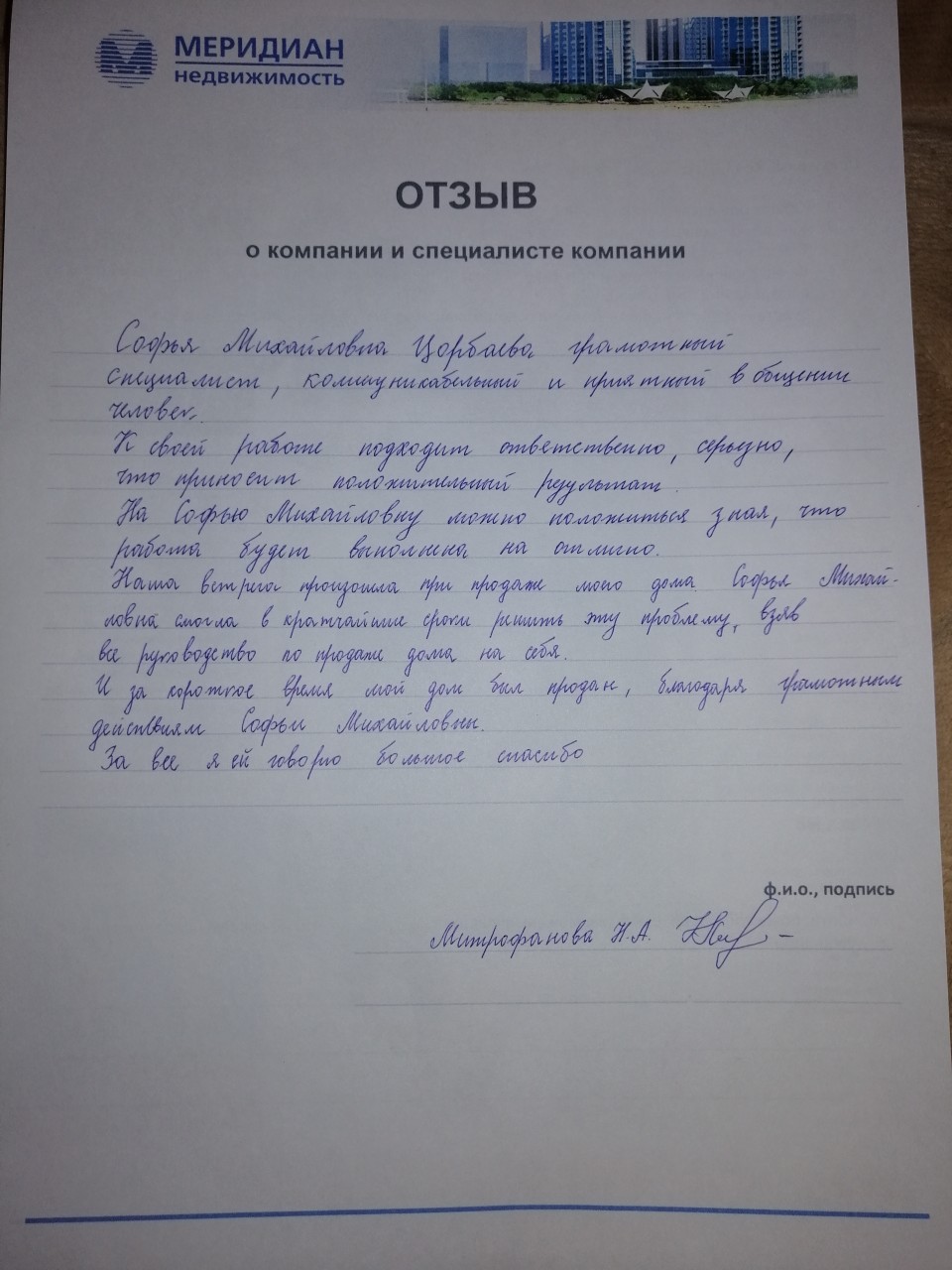 Хочется выразить огромную благодарность всему коллективу агенства недвижимости «Меридиан», в особенности Левшиной Зое Михайловне. Благодаря её профессионализму, грамотности, активности, мы смогли продать квартиру всего за 1,5 месяца!!! До этого мы сотрудничали с другим агенством, которое не помогло нам с продажей и Квартира простаивала целый год. Зоя Михайловна, как и весь коллектив относиться к клиентам с особой чуткостью, пониманием и заботой. Ещё раз благодарим за помощь. Будем рекомендовать всем знакомым. Хочется также отметить, что данное агенство недвижимости мы нашли по положительным отзывам в интернете. !!!Они были исключительно положительными!!!Этот тот самый случай, когда отзывам стоит доверять!