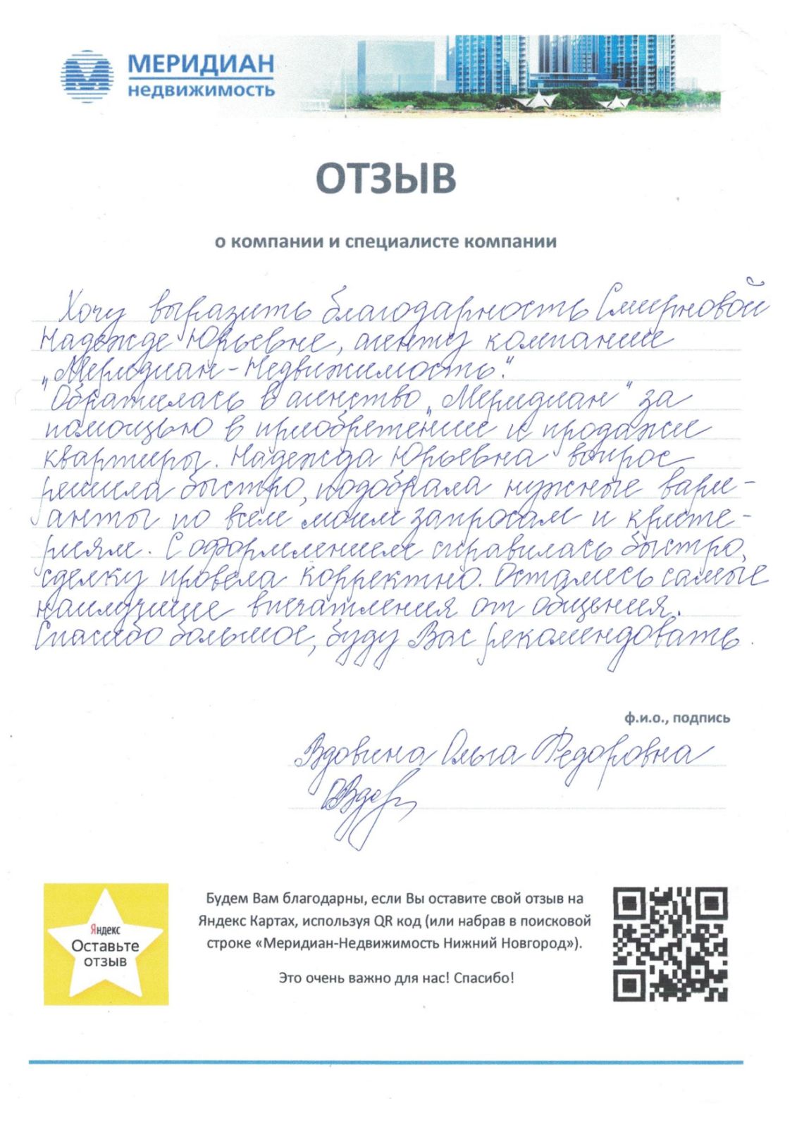 Хочу выразить благодарность Смирновой Надежде Юрьевне, агенту компании «Меридиан-Недвижимость». Обратилась в агентство «Меридиан» за помощью в приобретении и продажи квартиры. Надежда Юрьевна вопрос решила быстро, подобрала нужные варианты по всем моим запросам и критериям. С оформлением справилась быстро, сделку провела корректно. Остались самые наилучшие впечатления от общения. Спасибо большое, буду Вас рекомендовать!