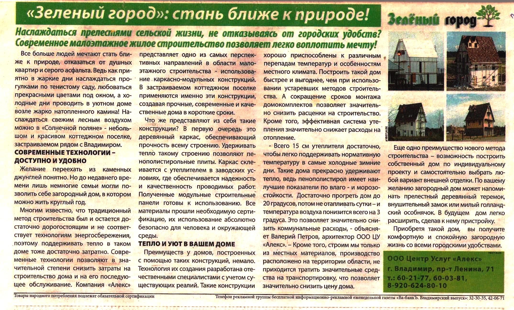 Такого ООО в реальности не существует! Это маркетинговая выдумка должностных лиц агентства недвижимости ООО ЦУ "АЛЕКС" (директор Лушников А. И.). По фактам недобросовестной деятельности должностных лиц ООО ЦУ "АЛЕКС" Следственным Комитетом города Владимира ведётся доследственная проверка. Директор ООО ЦУ "АЛЕКС" отказывается от принятых на себя обязательств и претензий со стороны потребителей и подрядчиков. Строительство жилых домов по ул. Солнечной в п. Никулитно ведётся с грубыми нарушениями Градостроительного Кодекса РФ - при явном попустительстве орагнов местного самоуправления. В рекламе "Зелёного города" незаконно используются фотографии этапов строительства выставочного дома по проекту ООО "КаМКон" (Санкт-Петербург), построенного в 2007 году группой компании "Архстудия-Дом" на постоянно действующей выставке "Коттеджи в Озерках" (СПб, Выборгское шоссе, 200). В рекламной статье, опубликованной в "Ва-Банке" без согласия правообладателей, архитектором ООО "АЛЕКС" назван Валерий Петров, что не соответствует действительности.