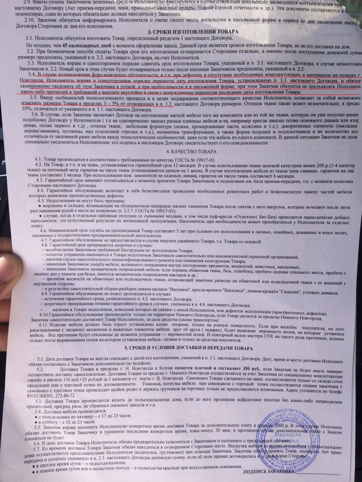 Обещали сделать за две недели и привести. Ждем не дождемся, третья уже прошла. спим на полу. Третий раз перенесли дату доставки дивана (вторник, пятница, и вот сейчас говорят: на следующей неделе) Почитала отзывы- видимо долго нам еще ждать. Прочитайте внимательно условия договора, которые составлены в пользу продавца, а не покупателя! По ним, если даже нам не сделают диван за 45 дней изготовитель вправе сославшись на форс-мажорные условия (например неимение данной ткани на базе), передвинуть сроки изготовления на сколько, сколько ему потребуется! По идее, если мы даже сейчас выберем другую ткань, ситуация неимения ткани на складе вновь может повториться через 45 дней и это будет по прежнему форс-мажор, который требует еще 45 дней. Замкнутый круг, в общем! Не дождемся через 45 дней - подадим в районный суд. Больше спать на полу невозможно!