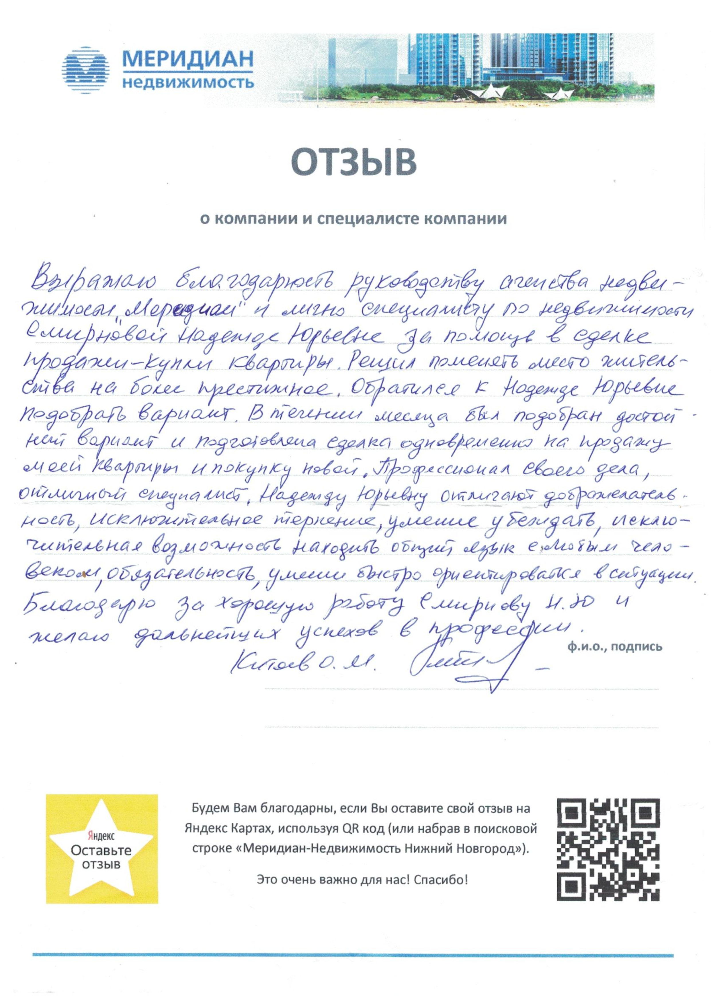 Выражаю благодарность руководству агентства недвижимости "Меридиан" и лично специалисту по недвижимости Смирновой Надежде Юрьевне за помощь в сделке купли-продажи квартиры. Решил поменять место жительства на более престижное. В течение месяца был подобран достойный вариант и подготовлена сделка одновременно на продажу моей квартиры и покупку новой. Профессионал своего дела, отличный специалист. Надежду Юрьевну отличают доброжелательность, исключительное терпение, умение убеждать, исключительная возможность находить общий язык с любым человеком, обязательность, умение быстро ориентироваться в ситуации. Благодарю за хорошую работу Смирнову Н.Ю. и желаю дальнейших успехов в профессии.