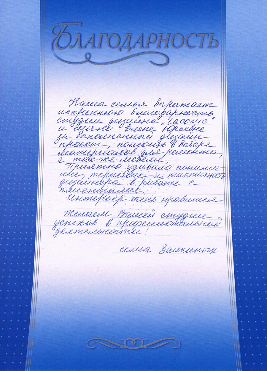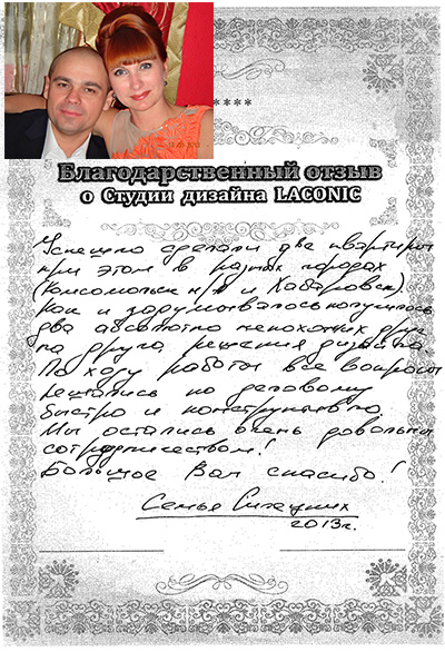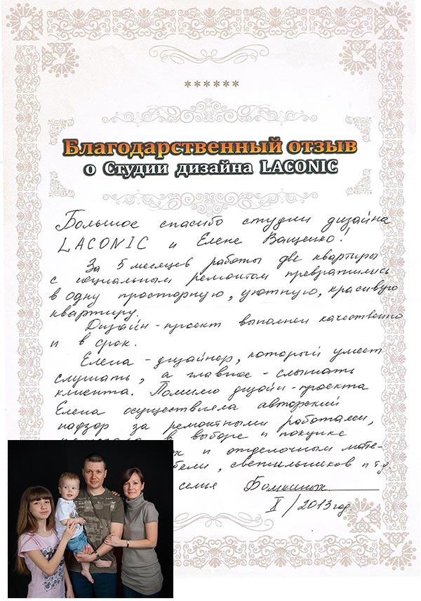 Нашей семье очень повезло! Мы достаточно долго выбирали дизайнера. Просмотрев огромное количество портфолио нас приятно поразили проекты студии дизайна LACONIC...