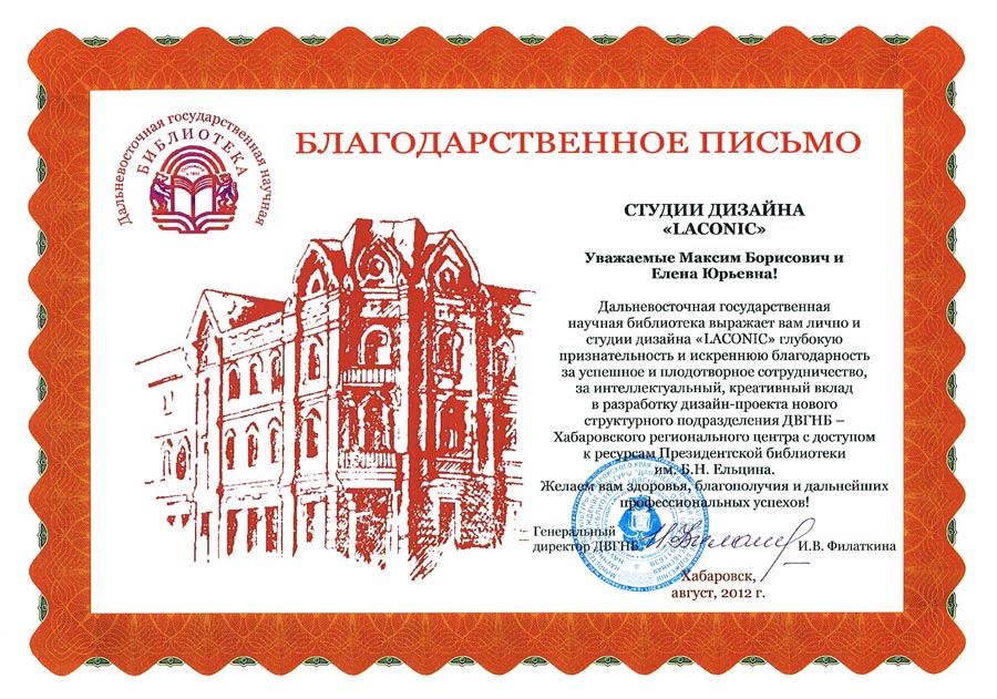 Выражаем благодарность ООО "ЛАКОНИК" за качественно выполненную работу, на высоком профессиональном уровне, за добросовестное отношение к делу и индивидуальный подход, при котором были учтены все наши пожелания! Желаем творческих вдохновений, больших успехов и процветания! (Филиал РОСЖЕЛДОРСНАБ, Хабаровская дирекция МТО РЖД)