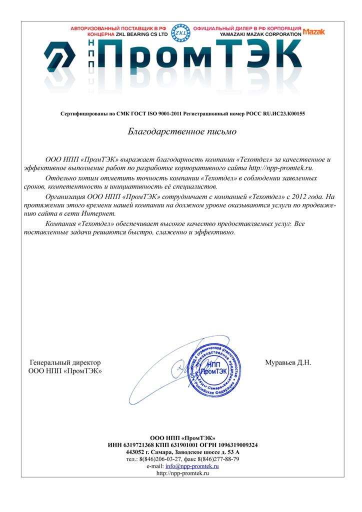 Организация ООО НПП «ПромТЭК» сотрудничает с компанией «Техотдел» с 2012 года. На протяжении этого времени нашей компании на должном уровне оказываются услуги по продвижению сайта в сети Интернет. Компания «Техотдел» обеспечивает высокое качество предоставляемых услуг. Все поставленные задачи решаются быстро, слаженно и эффективно. Генеральный директор ООО НПП"ПромТЭК" Муравьев Д.Н.