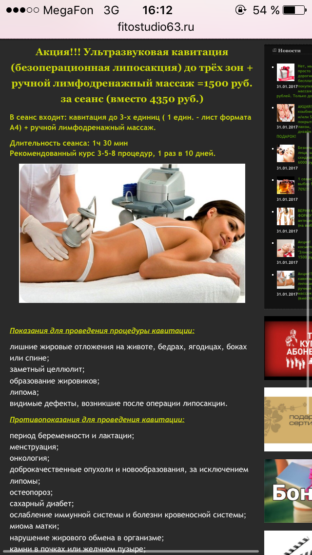 Где отзыв писать-не понятно.На сайте не доступно, в группе соц.сети Вконтакте нигде даже и не упомянуто об этом. Сотрудники всеми путями не хотят говорить, где оставить отзыв. Я думала такого уже не существует в наше время. Никому не порекомендую,напишу везде,где только можно об этом месте. Процедура кавитации,описание во вложении,стоимость до трёх зон 1500,длительность 1,5 часа вместе с массажем.Так называемый лимфодренажный массаж и не массаж вовсе-5 минут поглаживания(можно о нем и не писать при описании процедуры кавитации).Специалист не пришла к назначенному времени,опоздала,не извинилась. Процедура длилась еле-еле 40 минут.В хороших салонах за одну зону такая же стоимость как и здесь со "скидкой".В этом месте (фитостудия) очень грязно,в изголовье кушетки,на которой проводится процедура стоит коробка со свернутыми в комок грязными носками.Стены забрызганные,ультразвуковой прибор грязный. Сотрудники разговаривать совершенно не умеют.На вопрос "где на сайте я могу оставить отзыв" мне ответили ,цитирую "там отзыв не оставляется,вы можете написать вконтакте".Что такое "там"?и "оставляется"? Как могут быть клиенты в салоне,в котором у сотрудников не грамотная речь ?Нет пониманий норм приличия?(при опоздании извиняться) На отзыв в соц.сети вконтакте мне ответили всего лишь :"нам важно ваше мнение",никакой адекватной реакции более не последовало
