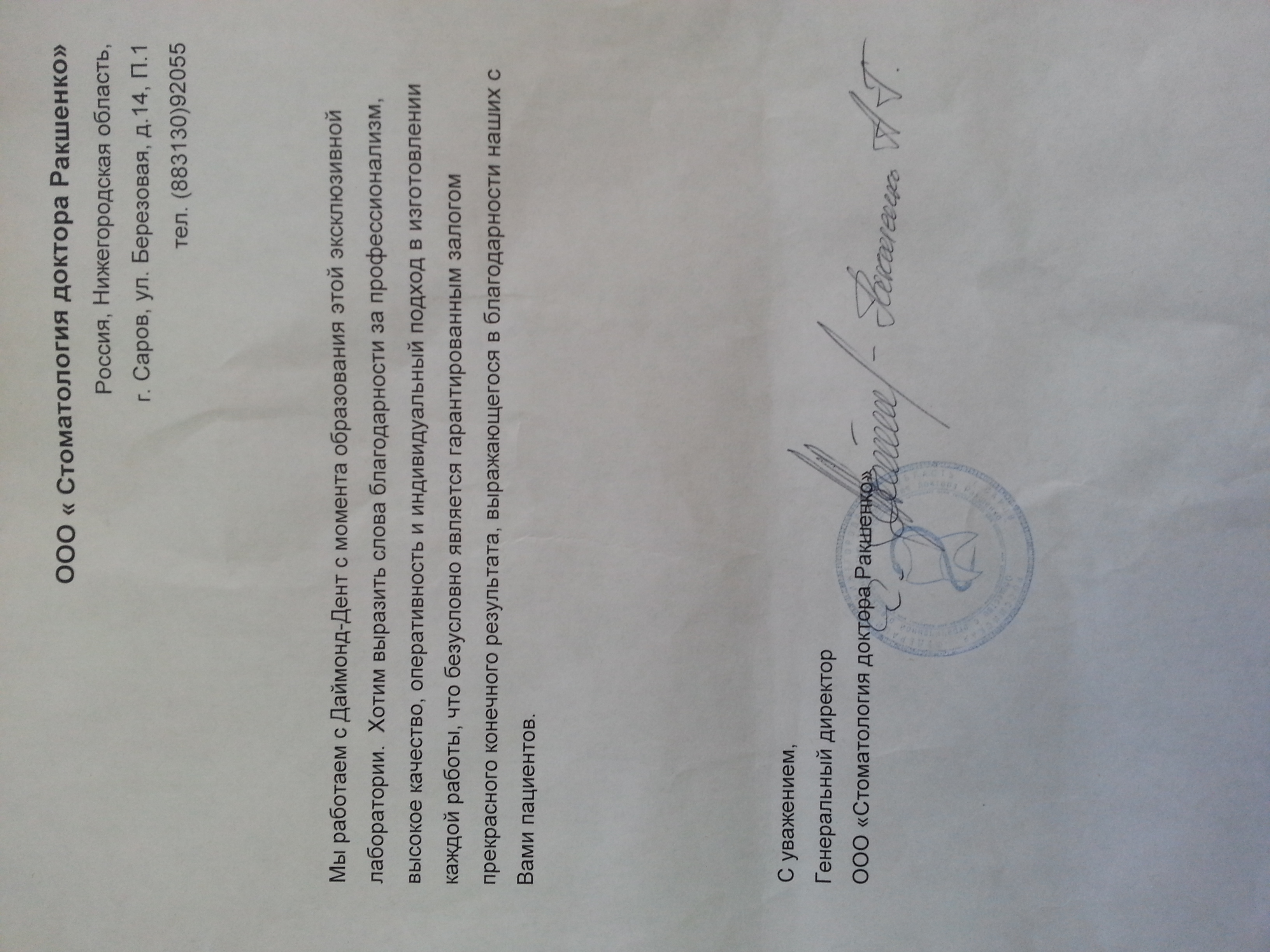 Мы работаем с Даймонд Дент с момента образования этой эксклюзивной лаборатории. Хотим выразить слова благодарности за профессионализм, высокое качество, оперативность и индивидуальный подход в изготовлении каждой работы, что безусловно является гарантированным залогом прекрасного конечного результата, выражающегося в благодарности наших с Вами пациентов. С уважением, Генеральный директор ООО "Стоматология доктора Ракшенко", Ракшенко А.Г.