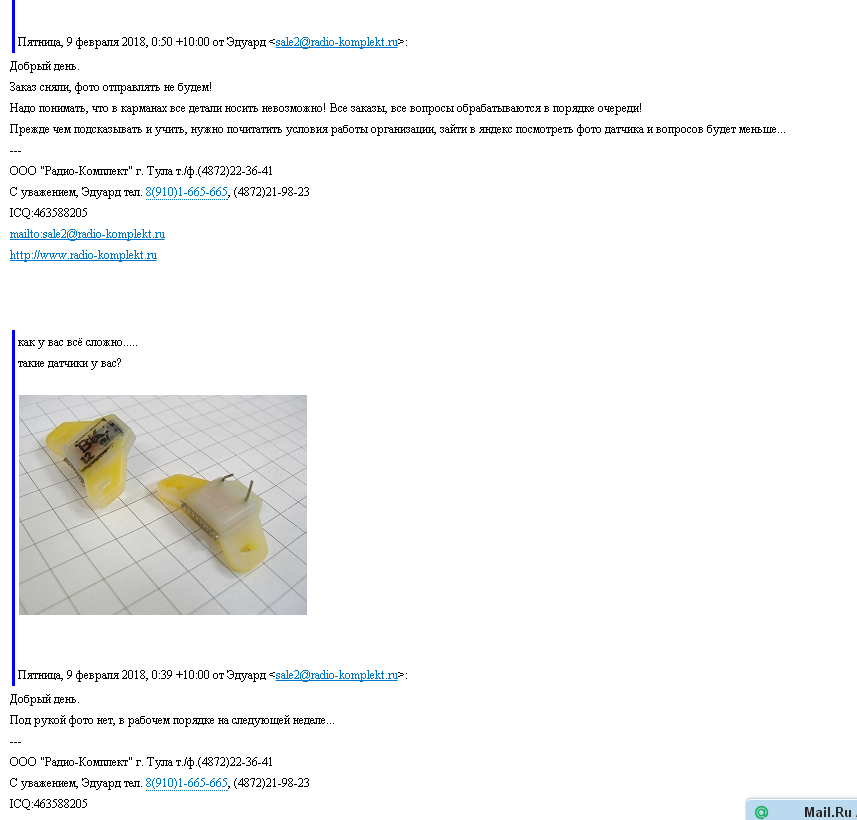 Компанию не рекомендую! Накручивают свой финансовый интерес к услугам почты. На уточнение, что это стоит дешевле, отвечают "тогда сами приезжайте и забирайте!" Эдуард, который видимо и директор и персонал в одном лице, на просьбу уточнить соответствие товара фотографии в яндексе, просто снял заказ. Прилагаю скрин переписки. Никому не рекомендую обращаться в эту контору.