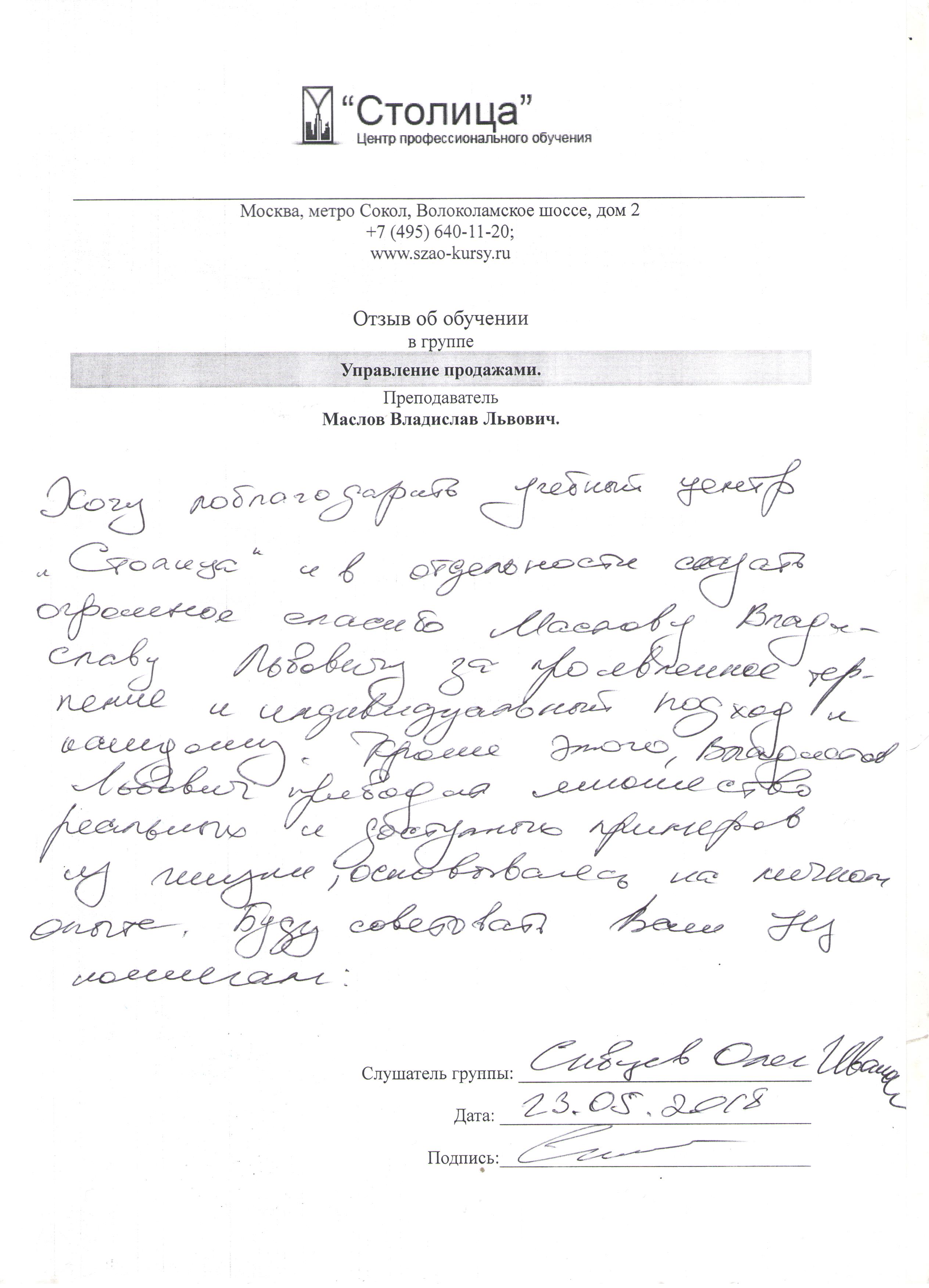 Хочу поблагодарить учебный центр «Столица» и в отдельности сказать огромное спасибо Маслову Владиславу Львовичу за проявленное терпение и иднивидуальный подход к каждому. Кроме этого, Владислав Львович приводил множество реальных и доступных примеров из жизни, основываясь на личном опыте. Буду советовать ваш учебный центр своим коллегам.