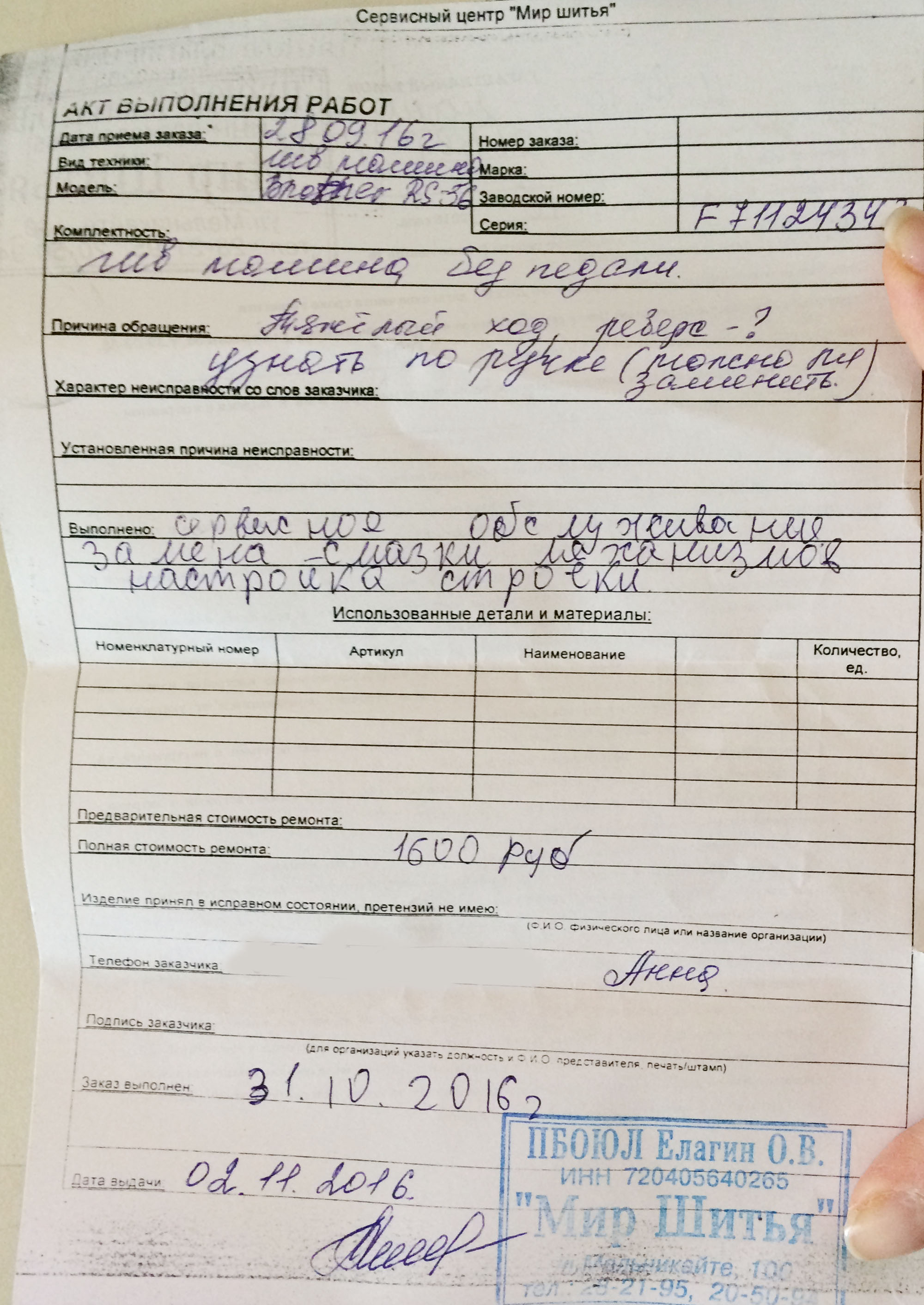 Обращалась в сервис магазина, как уважающей себя сети. И что получила в итоге? Ужасный сервис и очень недоброжелательные продавцы. Отнесла свою видавшую виды машинку Brother в ремонт, с конкретными жалобами; говорю, пусть мастер посмотрит повнимательнее, ее надо не просто смазать, возможно какие-то втулки уже разбились за годы эксплуатации, что-то поменять нужно, отрегулируйте ход, нормализуйте реверс, мотор очень тяжело гудит. И что вы думаете, выдали мне машинку просто смазанную. Грязную при том. Спрашиваю, а что сделали то на 1600? Ничего не сделали! Все как было так и осталось. А смазать я и сама могу, купив бутылёк машинного масла. Ах да, еще момент! Когда попросила дать мне место протестировать выполненную работу, на меня сделали такие круглые глаза! Вроде, чего там проверять то! Нет уж, говорю. будьте любезны, предоставьте мне стол и розетку. Замешкались и с недовольным видом все же дали мне такую возможность. Конечно я поняла что ничего кроме смазки не сделано, очень не хотелось платить. Но как всегда, подумала что наверно ничего более и нельзя было сделать.... В итоге муж мой сам ее разобрал, используя просторы интернета, нашел "слабые места", все отрегулировал и устранил неудобста при шитье. А "мастер" из сервиса даже задиры на верхней пластине не отшлифовал, хотя с такой пластиной шить нельзя. Прилагаю фото, обратите внимание на пункты: причина обращения, и выполненные работы. Совсем не одно и то же, правда? Ужасный сервис, разочарована, жаль времени и денег. Плюс еще меня и обсмеяли менеджеры, выдававшие машинку: "Что вы хотели, она же старая!" Не пойду к ним никогда ни за новой машиной, ни за аксессуарами. И цены у них завышены. Сейчас прекрасно все в интернет-магазинах покупается.