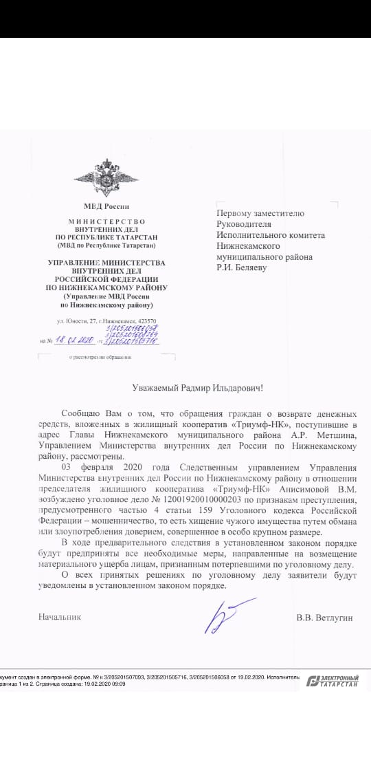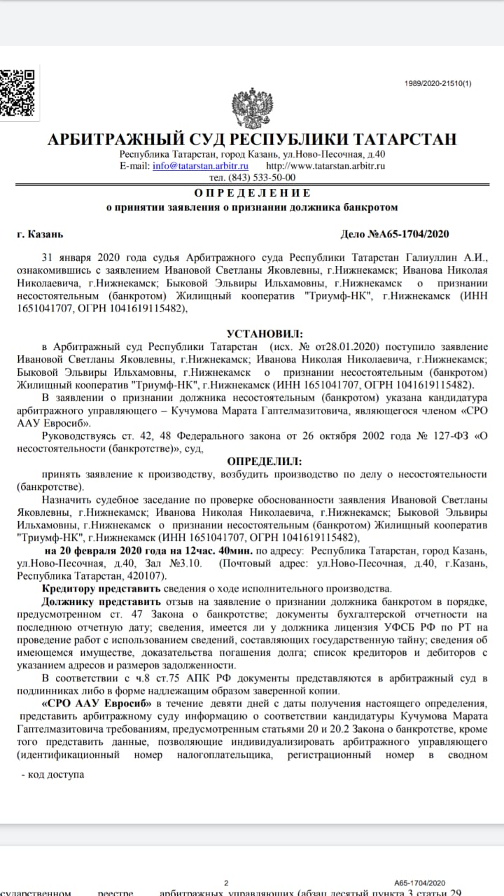 За 14.02 .2020г. на сайте Нижнекамского суда зафиксировано 12 заявлений с иском к Триумф нк ?! 169 заявлений с 3 по 13 февраля. По дате , по периоду можно получить отражение заявлений полученных судом на запрашиваемый момент времени. Всего по делу с участием Триумфа нк на сайте 1053 действия суда отображается при запросе в разделе "Судебное делопроизводство " с НАБОРОМ ВАМИ В "ПОИСК информации по делам " --Участник - ТРИУМФ - ("НК" добовлять не надо , иначе все 1053 дела и определения суда с участием Триумф нк отражены не будут). Наберите дату или период , который вас интересует , если необходимы не все имеющиеся в базе дела по Триумфу Нажать "искать" ниже. О П Р Е Д Е Л Е Н И Е о принятии заявления о признании должника банкротом г. Казань Дело №А65-1704/2020 31 января 2020 года судья Арбитражного суда Республики Татарстан Галиуллин А.И., ознакомившись с заявлением Ивановой Светланы Яковлевны, г.Нижнекамск; Иванова Николая Николаевича, г.Нижнекамск; Быковой Эльвиры Ильхамовны, г.Нижнекамск о признании несостоятельным (банкротом) Жилищный кооператив "Триумф-НК", г.Нижнекамск (ИНН 1651041707, ОГРН 1041619115482), УСТАНОВИЛ: в Арбитражный суд Республики Татарстан (исх. № от28.01.2020) поступило заявление Ивановой Светланы Яковлевны, г.Нижнекамск; Иванова Николая Николаевича, г.Нижнекамск; Быковой Эльвиры Ильхамовны, г.Нижнекамск о признании несостоятельным (банкротом) Жилищный кооператив "Триумф-НК", г.Нижнекамск (ИНН 1651041707, ОГРН 1041619115482). В заявлении о признании должника несостоятельным (банкротом) указана кандидатура арбитражного управляющего – Кучумова Марата Гаптелмазитовича http://kad.arbitr.ru/Card/5f761b24-bc39-4909-93b6-3a226953c3d9