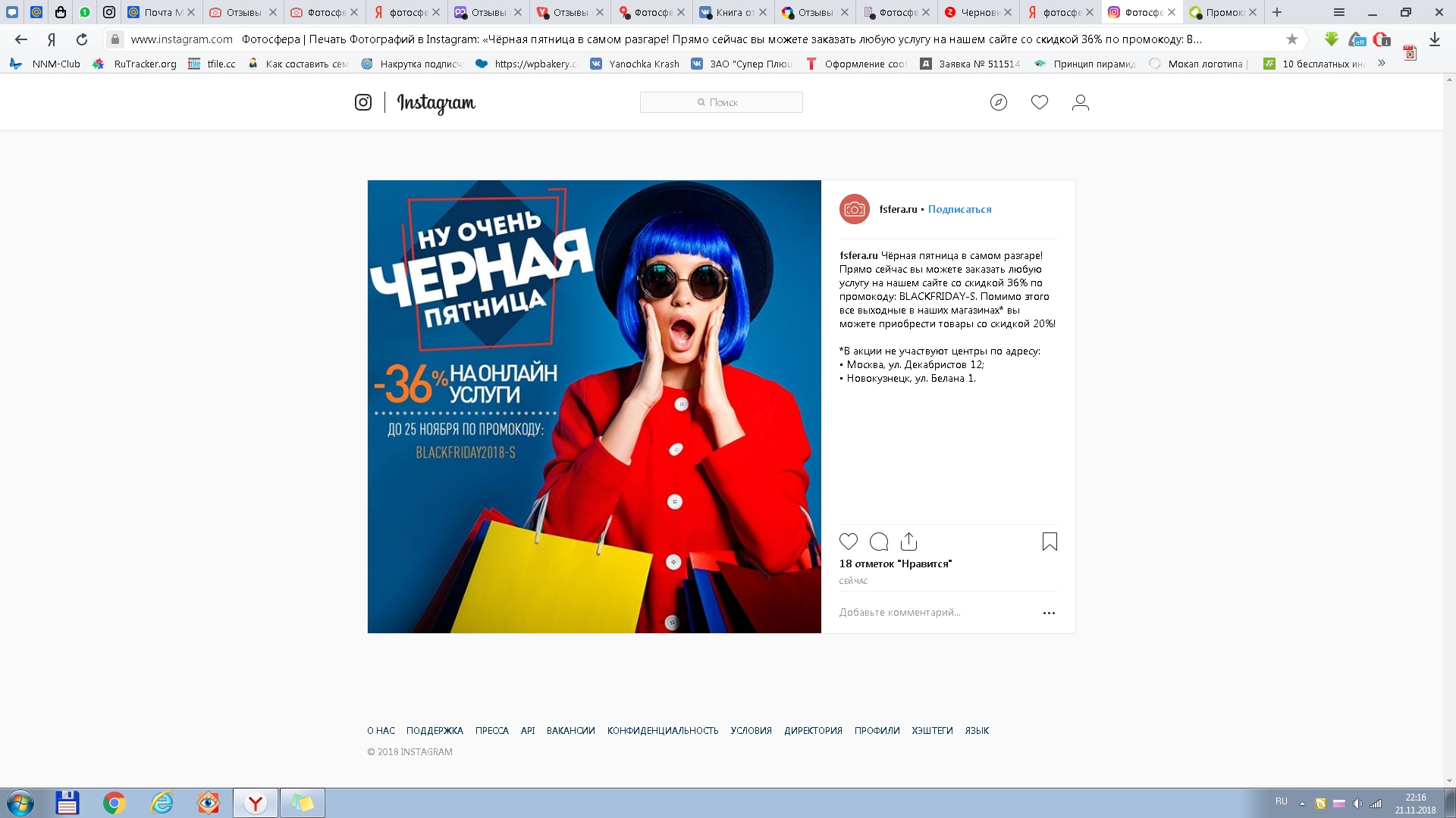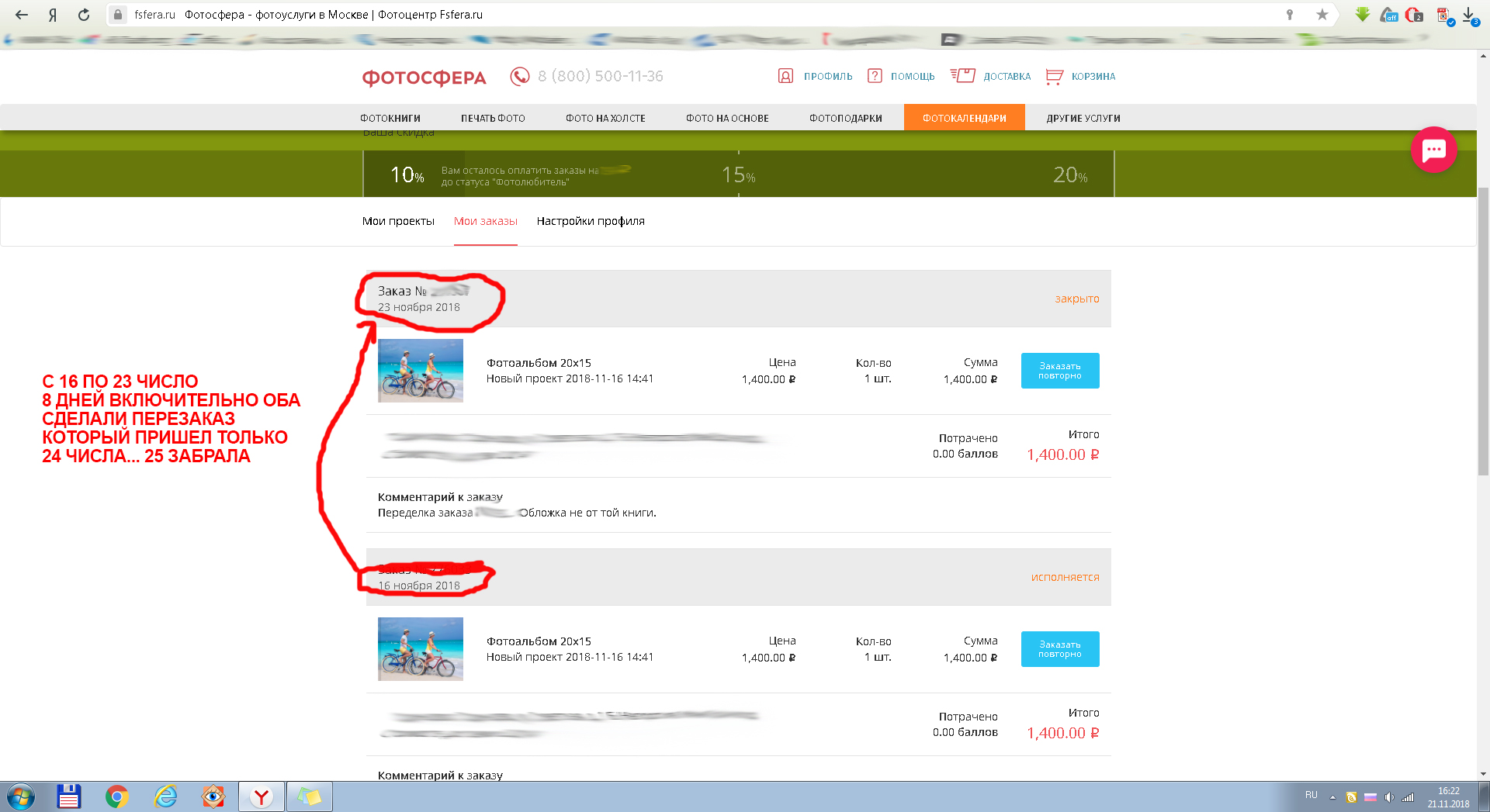 Моя ситуация совсем не из приятных. Заказала я у них фотокнигу, на день рождения уже взрослому отцу. Как раз чтобы приехать с подарком заказала пораньше на несколько дней! Приходит смс, что мой заказ готов и я могу его забрать. Прихожу. А там, при открытии, чтоб вы знали, ужас. Кромешный. Там вместо,моей обложки совершенно другие люди, а внутренности книги - мои. Как работают люди которые проверяют? Как работают люди которые собирают?!? Ладно пол беды, самое интересное дальше. Прямо в магазине перевыпускаем на перезаказ. в Черную пятницу ( как бы уже скидка должна быть) у них это написано (чтобы не быть голословной я теперь установила запись звонков и прикладываю скрины) Вышла из магазина, звоню менеджерам. Объясняю ситуацию, говорю "есть ли какая-то компенсация в таких случаях" , на что мне отвечают "да есть, 30% скидка" . звонок был 23 числа. Приезжаю забирать через 10 дней. И тут началось самое интересное..... ФОТОКНИГУ - 10 ДНЕЙ!!!! (а и ещё плюс 8 дней которые о ни до этого делали заказ) Мне говорят что никаких скидок нет по такому поводу,и менеджер на телефоне тоже самое сказал. То есть по будням есть скидки, а по выходным таких скидок нет? Хорошо,буду звонить им каждый день и спрашивать. А ещё обращусь в роспотребнадзор и в защиту прав потребителя.