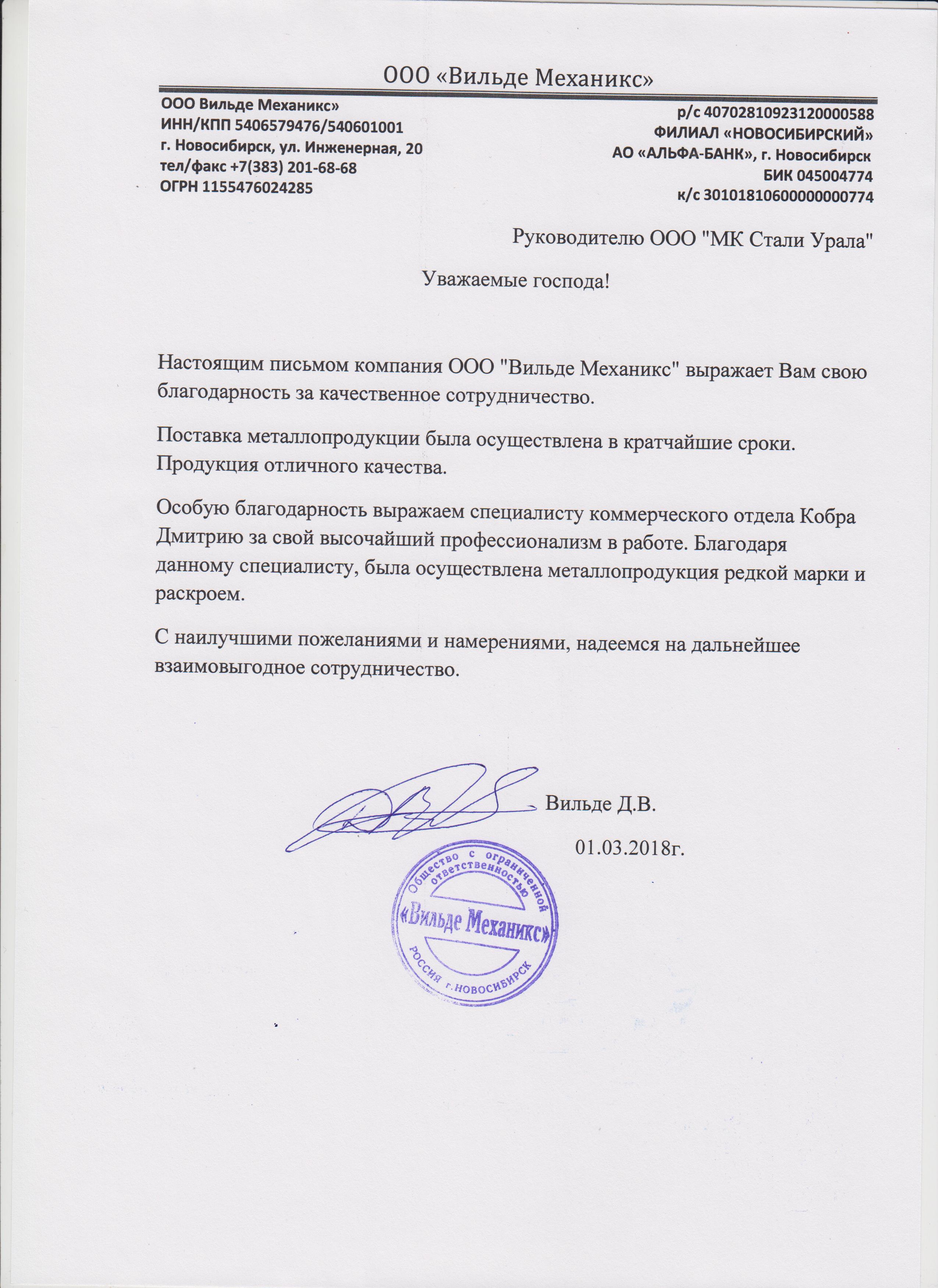 Настоящим письмом компания ООО "Вильде Механикс" выражает Вам свою благодарность за качественное сотрудничество. Поставка металлопродукции была осуществлена в кратчайшие сроки. Продукция отличного качества. Особую благодарность выражаем специалисту коммерческого отдела Кобра Дмитрию за свой высочайший профессионализм в работе. Благодаря данному специалисту, была осуществлена поставка металлопродукции редкой марки и раскрой. С наилучшими пожеланиями и намерениями, надеемся на дальнейшее взаимовыгодное сотрудничество.