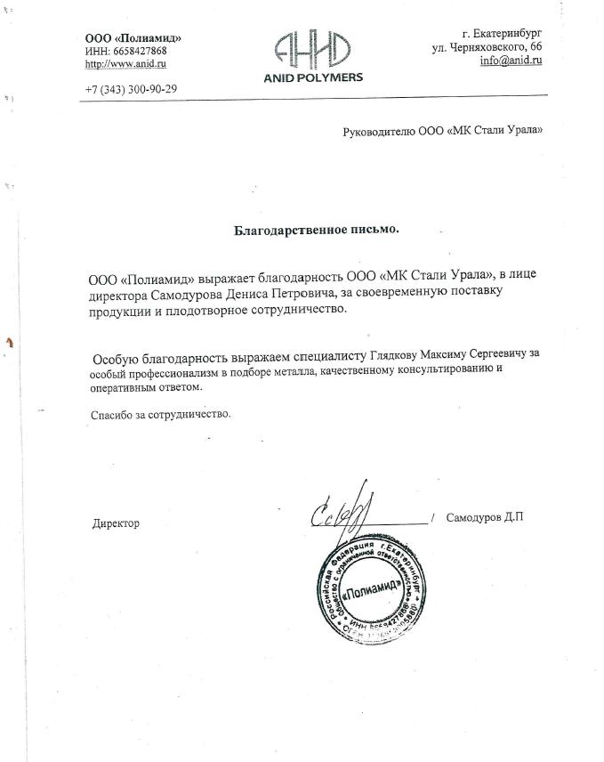 ООО "Полиамид" выражает благодарность ООО МК "Стали Урала", в лице директора Самодурова Дениса Петровича, за своевременную поставку продукции и плодотворное сотрудничество. Остобую благодарность выражаем специалисту Глядкову Максиму Сергеевичу за особый профессионализм в подборе металла, качественное консультирование и оперативный ответ. Спасибо за сотрудничество.