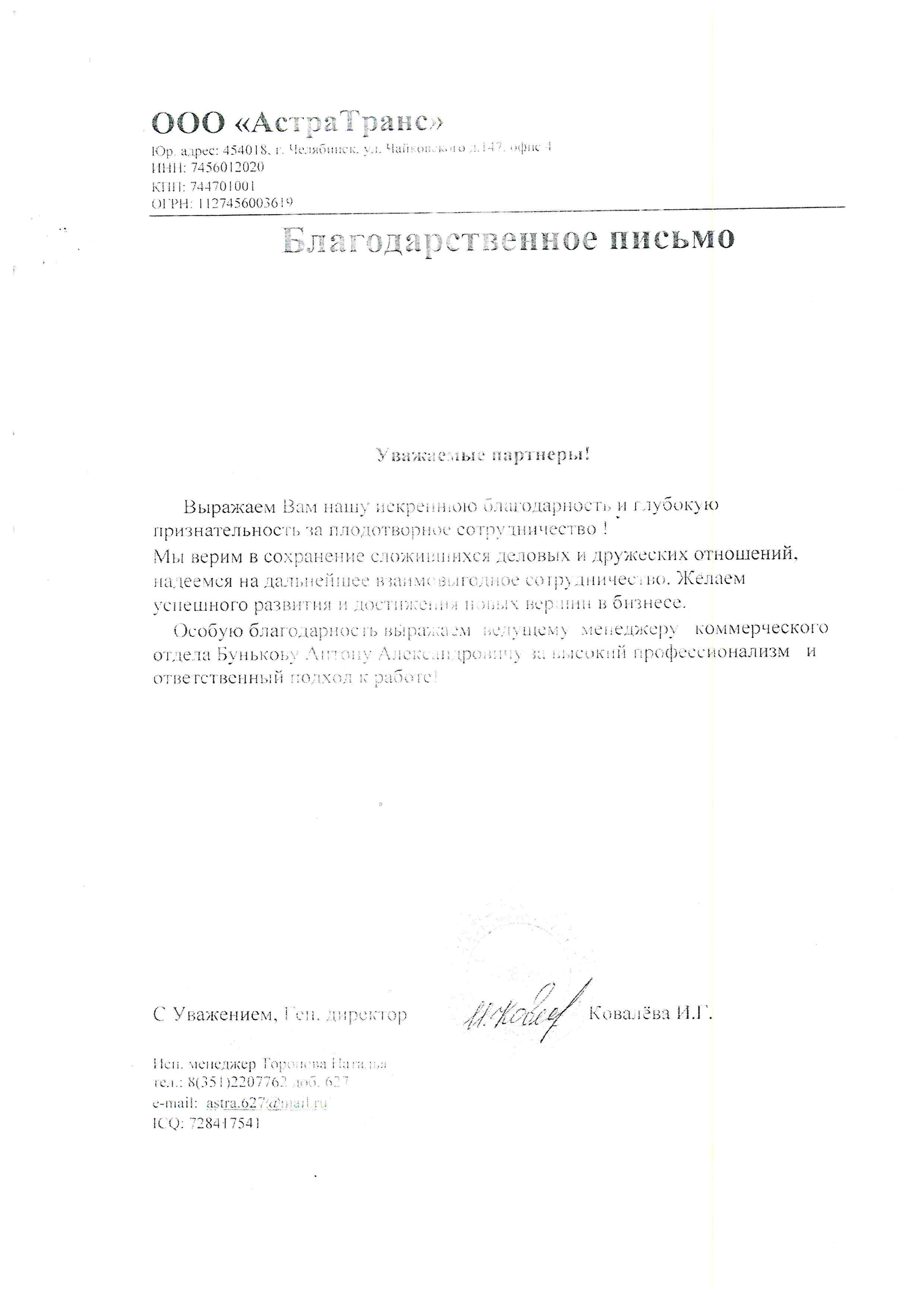 Уважаемые партнеры! Выражаем Вам нашу искреннюю благодарность и глубокую признательность за плодотворное сотрудничество! Мы верим в сохранение сложившихся деловых и дружеских отношений, надеемся на дальнейшее взаимовыгодное сотрудничество. Желаем успешного развития и достижения новых вершин в бизнесе. Особую благодарность выражаем ведущему менеджеру коммерческого отдела Бунькову Антону Александровичу за высокий профессионализм и ответственный подход к работе!