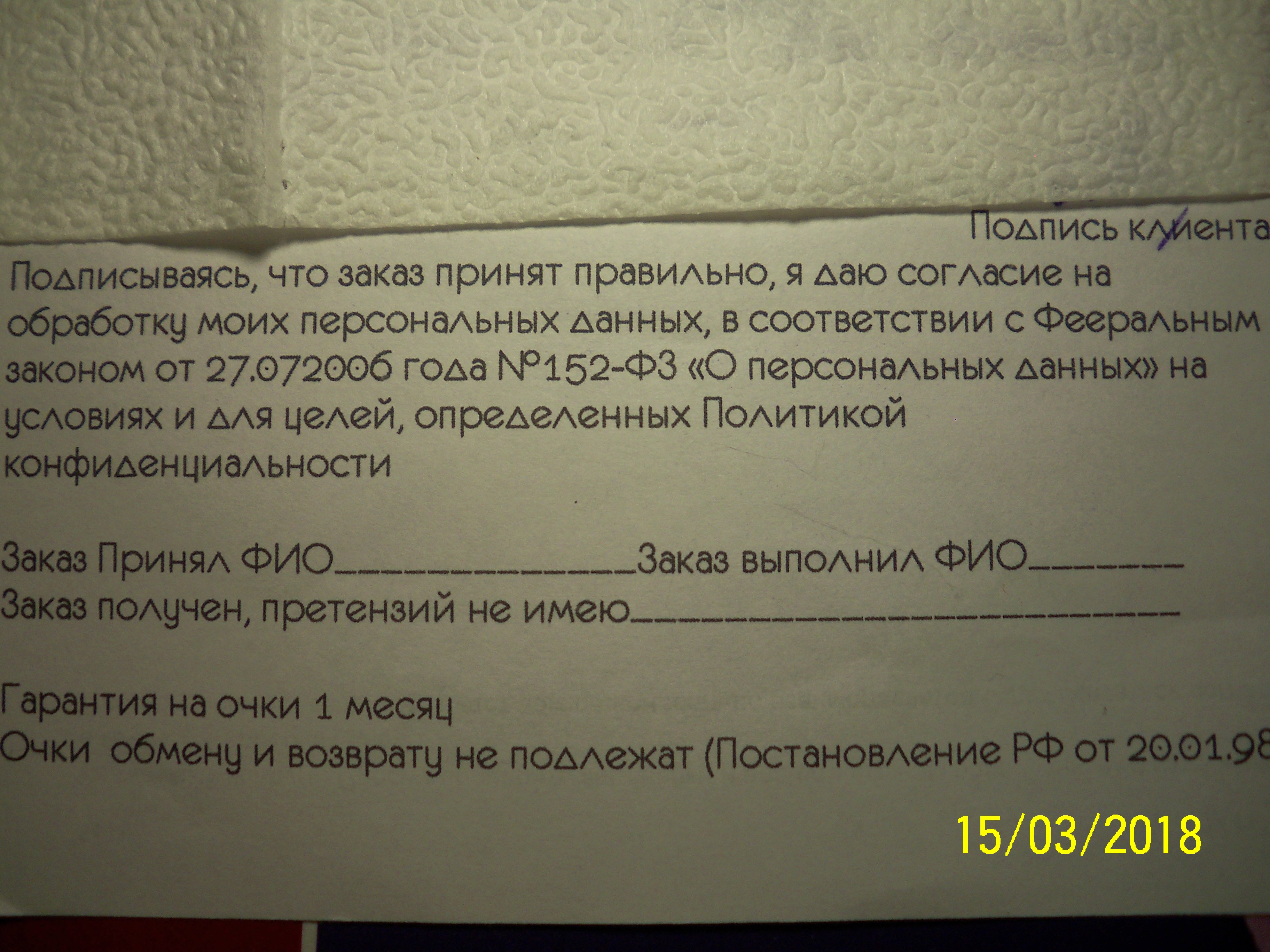 Предприятие со своими законами и правилами. В частности нарушение закона в установлении гарантийного срока на оправы (30 дн.), вопреки п.5 ЗОЗПП РФ, который устанавливает этот срок в три месяца. В квитанции написано, что "Очки обмену и возврату не подлежат". Ссылка на какое то постановление РФ от 20.01.98. Куда смотрит "Роспотребнадзор"???- не понятно... Руководителя найти абсолютно не возможно, прячется от клиентов, отказывается отвечать за отвратительную организацию своего хозяйства и нарушения законодательства РФ. Предлагаю ознакомиться с установленной в "ДЕО оптика" формой квитанции, которая является верхом невежества и наплевательского отношения к существующим нормам законодательства.