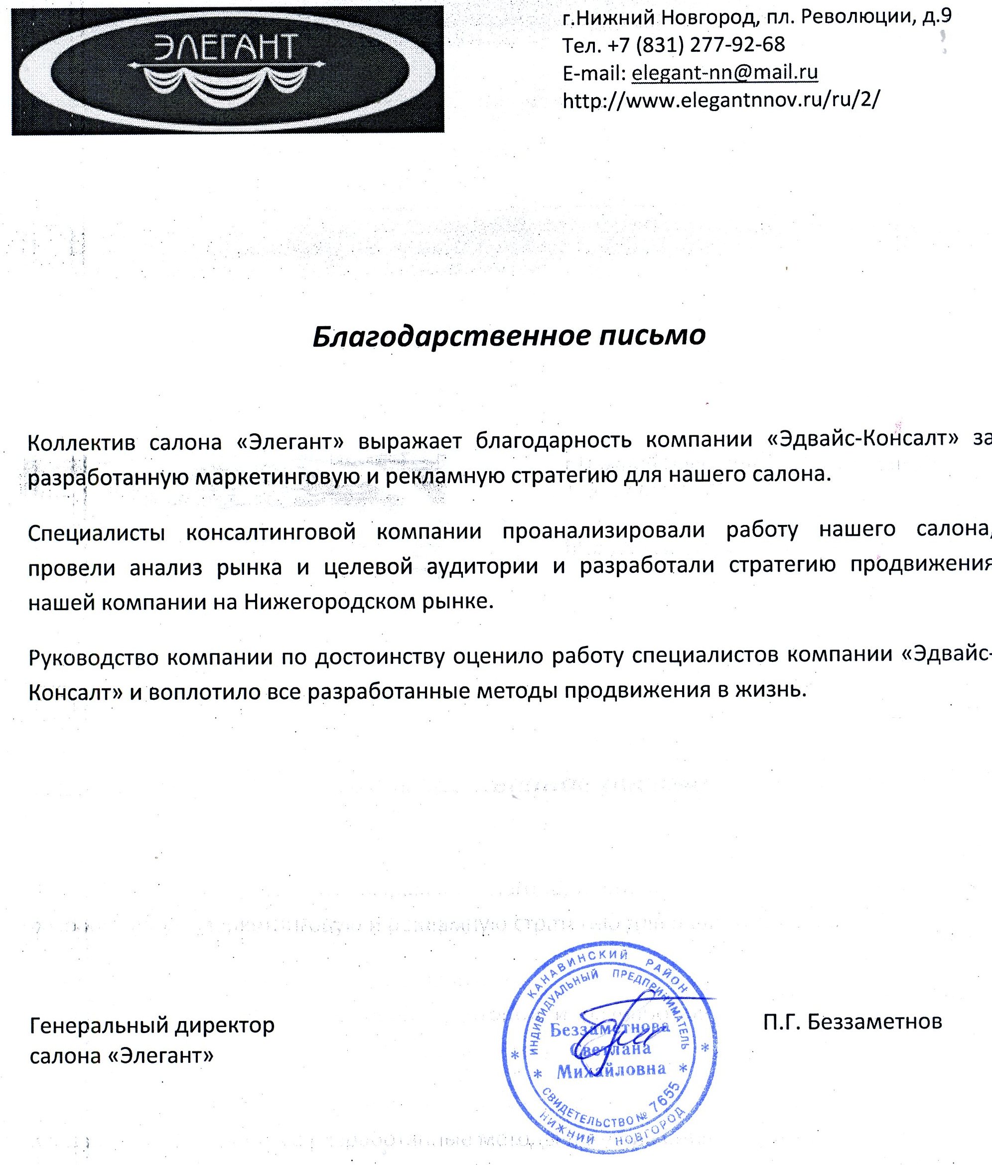 ИП Шибаева благодарит консалтинговую компанию ООО «Эдвайс-Консалт» за высокопрофессиональную, качественную и своевременную работу по проведению маркетингового исследования рынка детской одежды города Нижнего Новгорода. Хочется отметить высокую квалификацию сотрудников ООО «Эдвайс-Консалт», четко выполнивших поставленные задачи, благодаря которым была проделана большая работа, а именно, был проведен детальный анализ рынка, выявлены перспективные направления развития на данном рыночном сегменте. Кроме того, конкурентный анализ позволил определить наиболее перспективное место расположения торговой точки. Особо благодарна команде сотрудников за их уважительное отношение, позволившее соблюсти сроки выполнения проекта.