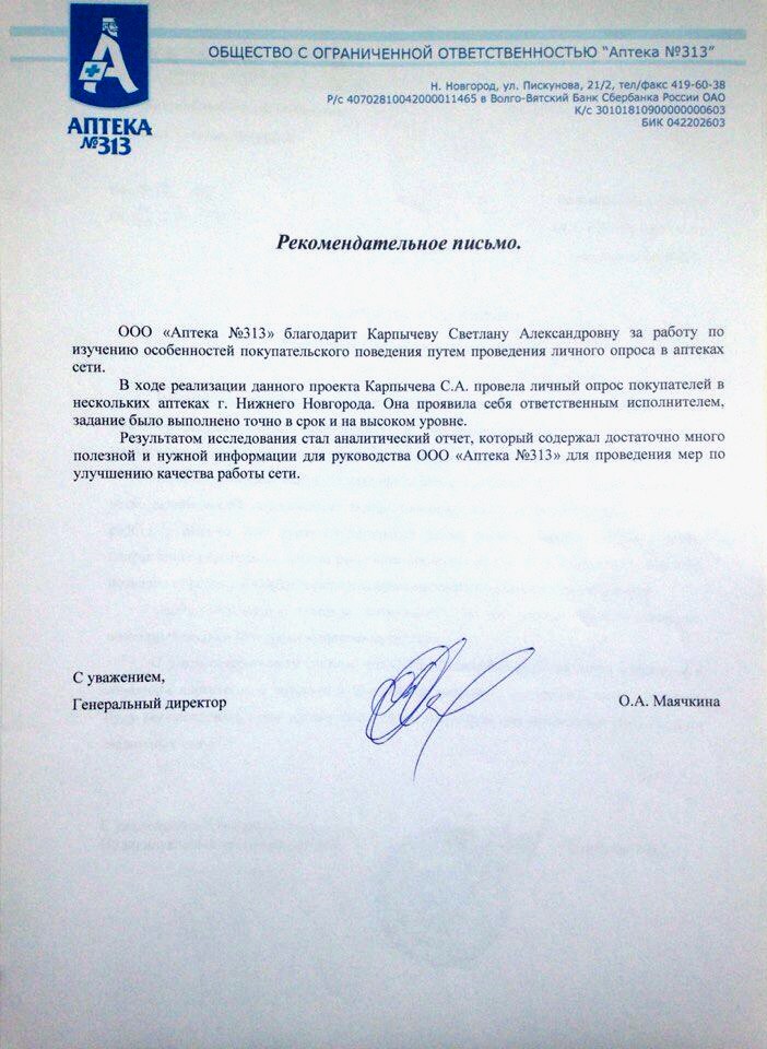 Сеть аптек ООО «Аптека №313» благодарит Карпычеву Светлану Александровну за изучение особенностей покупательского поведения путем проведения личного опроса в аптеках сети. Результатом исследования стал аналитический отчет, который содержал достаточно много полезной и нужной информации для руководства ООО «Аптека №313» для проведения мер по улучшению качества работы сети.