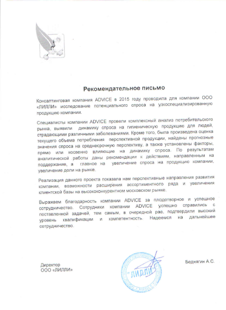 Консалтинговая компания ADVICE в 2015 году проводила для компании ООО «ЛИЛЛИ» исследование потенциального спроса на узкоспециализированную продукцию компании. Реализация данного проекта показала нам перспективные направления развития компании, возможности расширения ассортиментного ряда и увеличения клиентской базы на высококонкурентном московском рынке. Выражаем благодарность компании ADVICE за плодотворное и успешное сотрудничество. Сотрудники компании ADVICE успешно справились с поставленной задачей, тем самым, в очередной раз, подтвердили высокий уровень квалификации и компетентность. Надеемся на дальнейшее сотрудничество. Беднягин А.С., директор ООО «ЛИЛЛИ»