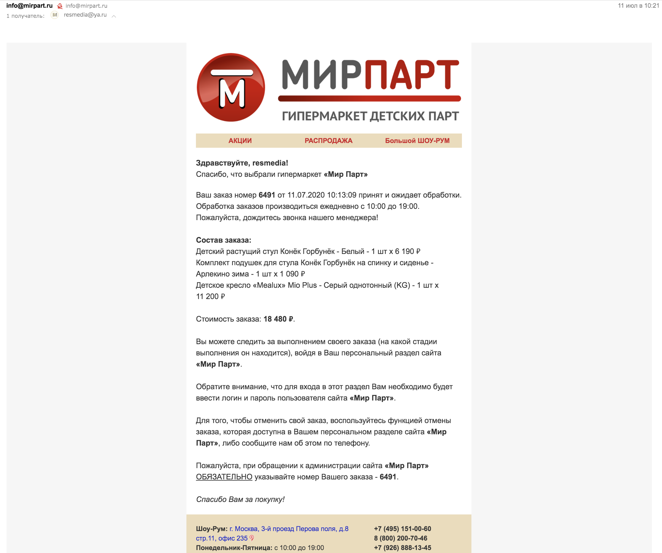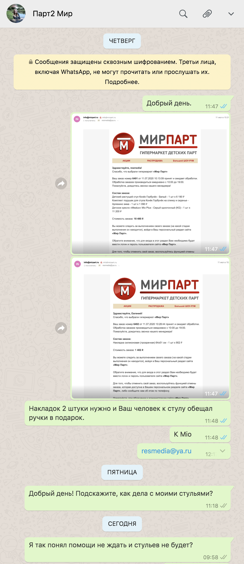 Доброго всем времени суток! Начну сразу с того, что категорически НЕ рекомендую, что-то покупать в этом магазине "МИРПАРТ РФ"! Теперь подробнее: 11 июля 2020 года заказал в этом магазине 2 стула на сумму 18 480 рублей и дополнительные аксессуары. Мне перезвонили и сообщили, что одного стула нет, предложили альтернативы, но они не подошли. Тогда мы договорились, о том, что я делаю заказ и через месяц мне все прийдет, причем я несколько раз спросил, нужно ли мне искать в другом месте, на что ответили нет конечно, все будет. 20 августа 2020 года я сам начал звонить и интересоваться заказом, но как оказалось его нет и товаров тоже конечно же нет, ладно если бы предложили что-то другое и как-то выйти из ситуации, пообещали решить проблему и пропали на сообщения отвечать просто перестали. Нормальные люди себя так не ведут.
