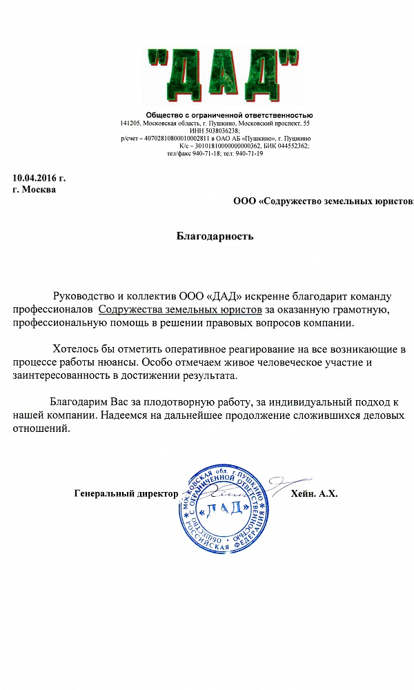 Компания ООО "ДАД" обращалась в компанию "Содружество Земельных юристов" за помощью в решении спорного вопроса, что возник в процессе нашей работы с одним из клиентов. Самостоятельно наши юристы решить вопрос не смогли, и мы искали узкопрофильных специалистов на стороне. Обратившись в компанию "Содружество Земельных юристов" мы получили качественную профессиональную помощь в интересующем нас вопросе. Здесь нас проконсультировали, а так же оказали юридическую помощь. Хотелось бы отметить живое человеческое участие, индивидуальный подход к нашему делу, быстрое реагирование на мельчайшие изменения в нашем вопросе, а так же желание достичь положительный результат в короткие сроки. Спасибо! Надеемся и в дальнейшем на такое плодотворное сотрудничество.