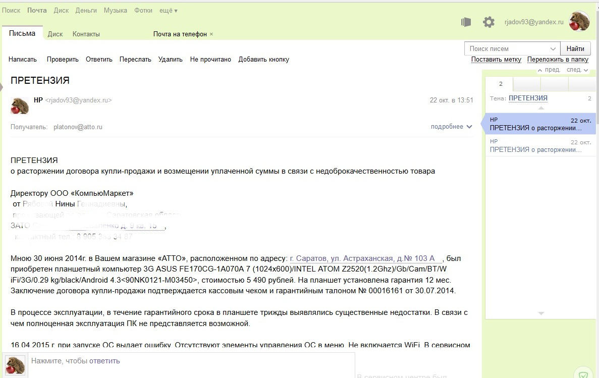 Меня угораздило купить в магазине "АТТО" на Астраханской 103 А планшет, который очень скоро сломался. С апреля месяца он ломался трижды, последние два сразу же, после гарантийного ремонта, на третий раз перестал включаться после спящего режима. Отдала ПК сотрудникам магазина, в моем присутствии, сбросили установки до заводских, что не помогло в устранении неисправности и приняли планшет с моим заявлением о расторжении договора. Через полтора месяца приезжаю в магазин, сотрудники говорят, чтобы я забирала планшет (неисправность которого не подтверждена по заявлению сервисного центра) или ехала в сервис "ругаться"(их формулировка), потому что сами они никакого отношения к этой теме не имеют, они всего лишь продавцы (дословно практически). Т.е. планшет, который в течение очень короткого срока постоянно нуждался серьезном в ремонте (его перепрошивали, меняли плату), починили в третий раз и пытаются мне его всучить обратно, как полностью рабочий, не смотря на то, что по закону, я имею право отказаться от выполнения договора и предъявлять претензии продавцу, а не ехать в сервисный центр. Письма в службу поддержки, директору, претензии, а так же обращения за помощью к исполняющему обязанности директора, не возымели никакого результата, на них просто не отвечают. Т.е. либо забирай, либо иди и ругайся туда, где те еще "доброжелательные" люди работают, судя по предыдущим комментариям. До последнего думала, что это недоразумение, но когда и Кралечкин М.А., так красочно разрекламировавший здесь степень своей ответственности и высоко оценивший деятельность компании "АТТО", обещавший решить вопрос, спустя почти 10 дней тишины, стал игнорировать мои сообщения, поняла, что в гневных отзывах определенно есть доля правды. Если Вы еще раздумываете и только собираете информацию, мой Вам совет, обходите эту контору за версту. Для компании "АТТО" закон о защите прав потребителя не существует! А если Вы, как и я столкнулись с подобного рода проблемами в отношении сотрудников "АТТО", прошу связаться со мной по адресу эл. почты rjadov93@yаndex.ru, не забудьте прикрепить сканкопии договоров, претензий, актов, чеков и т.д.