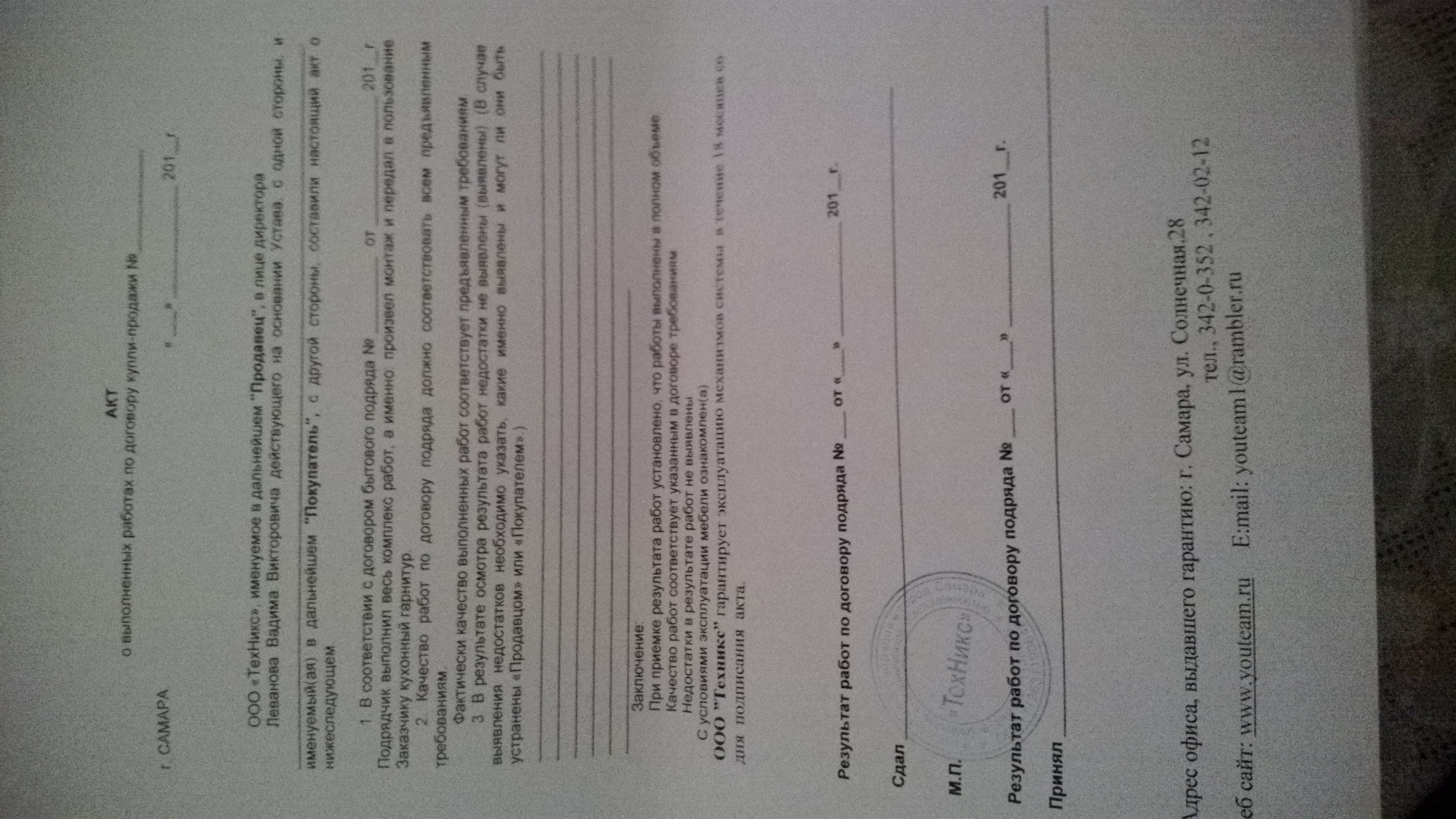 Обратились в компанию ЮТИМ в мае месяце, чтобы заказать кухню,оплатили 100%( точнее около 160000 руб) До сих пор ждем.Нет ни кухни ни денег. В назначенный срок в июле попросили все оплатить т.к кухня готова, что мы и сделали.На следующей неделе поставили каркас и сказали приедут завтра доделают. Завтра длится по сей день(декабрь),в итоге тишина.На мои звонки Анастасия(менеджер который брал деньги) отправляет общаться только с директором, якобы она ничего не знает. Директор все время что-то обещает и все не заканчивается. Хотели с мужем к рождению 3-го ребенка сделать ремонт и до сих пор не можем переехать из-за кухни, живем в съемной однушке уже с тремя детьми. Находясь на 9м месяце беременности я постоянно ругалась и просила доделать мне кухню и слышала одни обещания. Я очень разочарована и нахожусь в очень непростой ситуации благодаря этой фирме. Хотя до заказа видела их работы и все было очень даже неплохо. поэтому и заказала у них. Очень жаль что с нами так обошлись, сейчас судимся и опять все за наш счет. Результатов нет, только конфликты в семье и все из-за какой-то кухни!!! Уважаемые клиенты, прежде чем сделать заказ и оплатить посмотрите что написано в договоре и акте, т.к печати у фирмы вовсе не ЮНИТ а какой то ТЕХНИКС,я не думаю что мы одни такие, будьте внимательны и лучше не заказывайте в таких фирмах как ЮНИТ. Надеюсь что работать фирма будет недолго и директор Иванов Алексей и менеджер Корнеева Анастасия будут наказаны . Прилагаю фото своей "кухни" и печати в акте.
