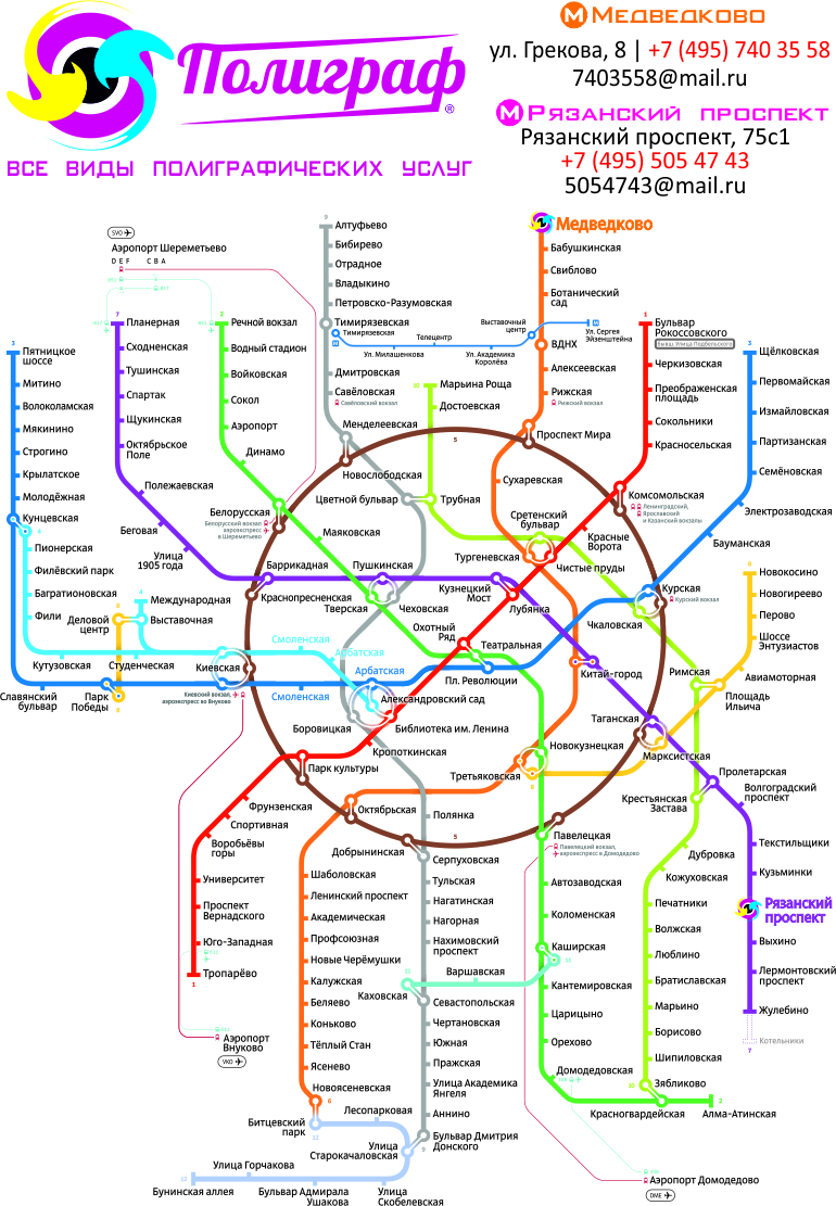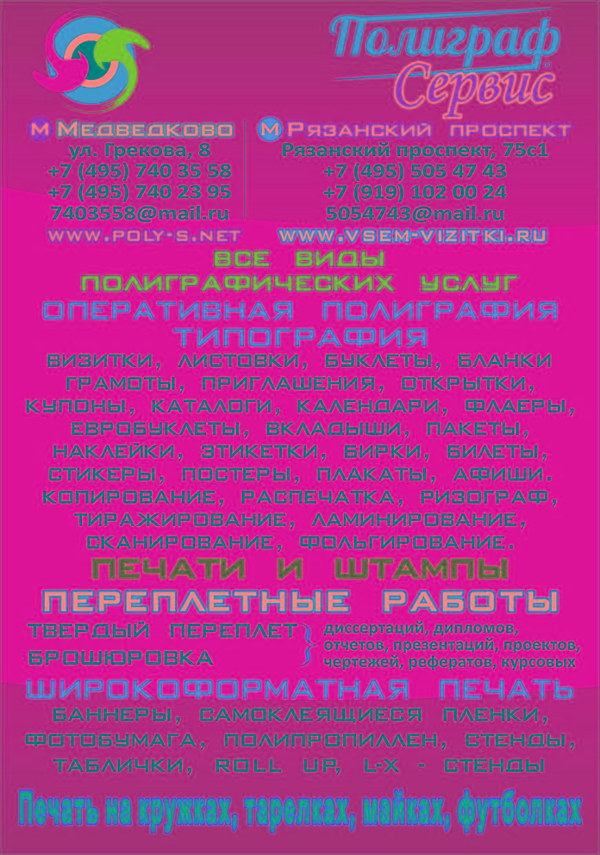 Отличная Оперативная полиграфия +7 (495) 740 35 58, +7 (495) 740 23 95 СВАО М. МЕДВЕДКОВО / 8(495)5054743, 8(919)1020024 ЮВАО М. РЯЗАНСКИЙ ПРОСПЕКТ. Надписи на обложках. ФУТБОЛКА С ЛОГОТИПОМ. ФИРМЕННАЯ КРУЖКА, БЕЙСБОЛКА. Визитки, Открытки, Листовки, Бланки, Флаера, Приглашения, Наклейки, Буклеты, Купоны, Ценники, Билеты, Бирки, Стикеры, Объявления, Меню, Бейджи Самокопирующиеся бланки, счета, накладные, БСО, бланки с нумерацией, Бланки строгой отчетности, Фирменные бланки, грамоты, каталоги. Карманные календарики. Авторефераты, Прайс-листы. Печать изображений на футболках, майках, кружках, тарелках, бейсболках. Штендеры. Таблички. Стенды. Выставочные стенды. Уличные стенды. Вывески. Печать наклеек на стекло автомобиля. Переплет и брошюровка дипломов, диссертаций, проектов, чертежей, отчетов, презентаций. Брошюровка на пластиковую и металлическую пружину. Широкоформатная интерьерная печать. Печать на пленке, баннере, бумаге. Плакаты. Постеры. Стикеры. Афиши. Чертежи. Плоттерная резка, Плоттерная резка наклеек любой формы и размера А0 А1 А2 А3 А4. Ламинирование, Сканирование, Фольгирование. Изготовим печати, штампы, факсимиле. Восстановим печать по оттиску. Тиражирование. Копирование. Ризограф. Типография. Полиграфия. Сублимация. Термоперенос. Печатный салон. Копировальный центр. Все работы выполняются Срочно. Самое современное оборудование от Xerox, Oki, Ricoh, Riso, Ideal, Cyklos, Fastbind, Bulros, Сольвентный плоттер Mimaki CJV30-100 позволяет выполнять любые заказы максимально быстро и качественно. Офис № 1: МОСКВА, ЮВАО, РЯЗАНСКИЙ ПРОСПЕКТ, Д. 75, С. 1. Рядом со станцией метро Рязанский проспект. 1-й вагон из центра, из метро направо 2-х этажное здание. Вход в кафе «Шоколад» между Бургер Кинг Burger King и супермаркетом «БИЛЛА». 2 этаж, направо по коридору. ТЕЛ: 8 (495) 505-47-43, 8 (919) 102-00-24. http://www.vsem-vizitki.ru Офис №2: Москва, СВАО, МЕТРО МЕДВЕДКОВО, УЛ. ГРЕКОВА, Д. 8. ПОСЛЕДНИЙ ВАГОН ИЗ ЦЕНТРА. ВЫХОД ИЗ МЕТРО НАЛЕВО ЧЕРЕЗ ДОРОГУ 30 МЕТРОВ ОТ МЕТРО. ВХОД С ТОРЦА ЗДАНИЯ. ТЕЛ.: 8 (495) 740 35 58, 8 (495) 740 23 95. http://www.poly-s.net Все виды полиграфических услуг http://www.vsem-vizitki.ru