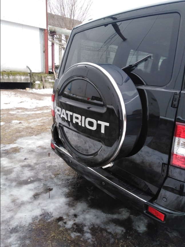 Здравствуйте. Решил таки сделать подарок, на новый год, своему Бегемоту. Для этого у ребят из Автомечты был закуплен бокс, из нержавейки, на запаску. Размер стандартный, 245. Одел я его на запаску. Всё бы хорошо, но хочется чтоб надпись, "Патриот" таки присутствовала. Решил использовать запчасти от штатного чехла. Для того чтоб он хорошо прилегал к кольцу из нержи, от «Автомечты» его пришлось обрезать. Для этого примерный контур был обклеен малярным скотчем. После этого тарелку от бокса из нержи положил сверху и отступив полтора сантиметра отметил линию отреза. Дальше, смело, болгаркой отрезал лишнее. Примерил. Всё подошло как надо. Результат на фото. Спасибо ребятам из «Автомечты».