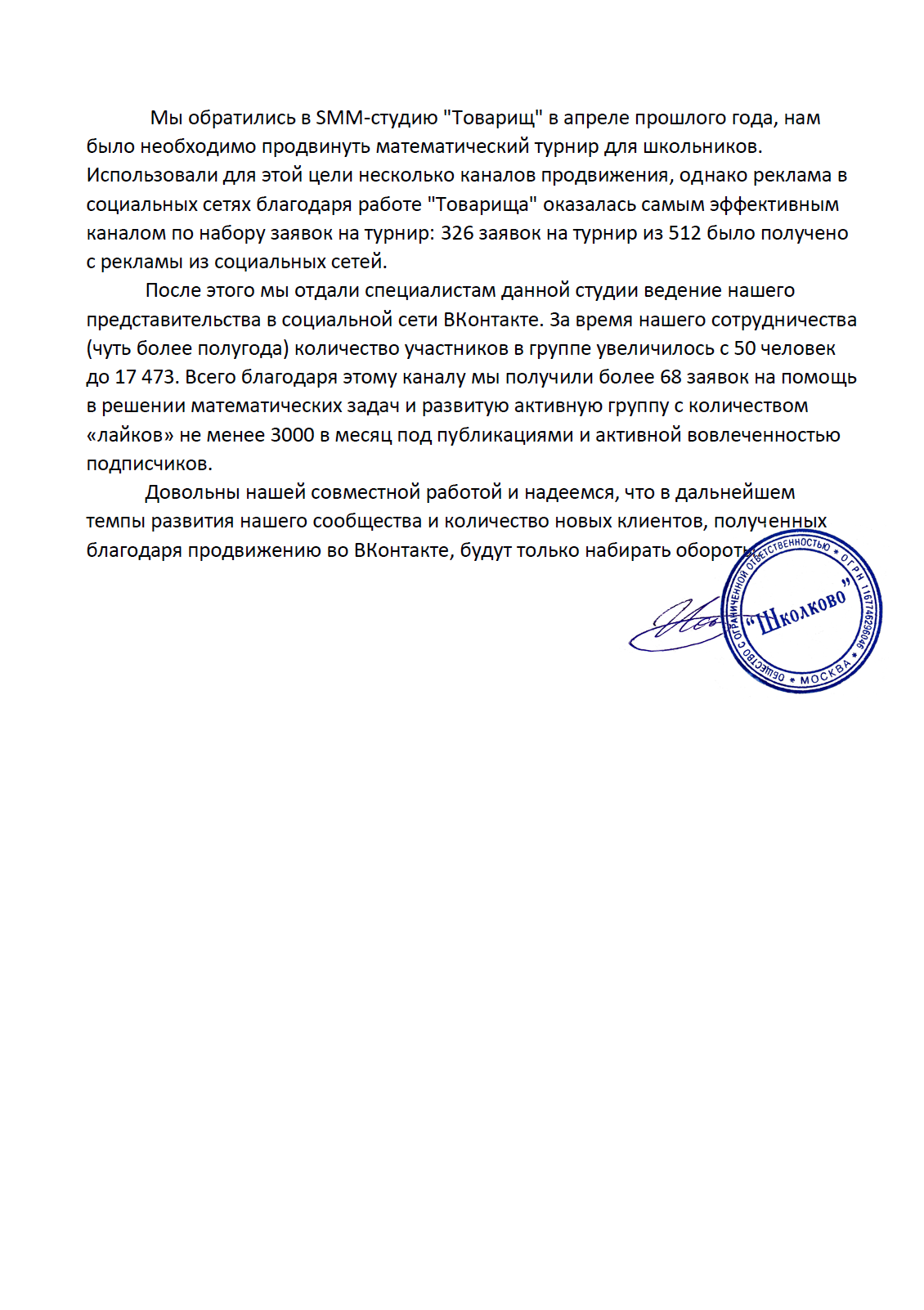 Мы обратились в SMM-студию "Товарищ" в апреле прошлого года, нам было необходимо продвинуть математический турнир для школьников. Использовали для этой цели несколько каналов продвижения, однако реклама в социальных сетях, благодаря работе "Товарища", оказалась самым эффективным каналом по набору заявок на турнир, 326 заявок на турнир из 512 было получено с рекламы из социальных сетей. После этого мы отдали специалистам данной студии ведение нашего представительства в социальной сети Вконтакте. За время нашего сотрудничества (чуть более полугода) количество участников в группе увеличилось с 50 человек до 17 473. Всего благодаря этому каналу мы получили более 68 заявок на помощь в решении математических задач и развитую активную группу с количеством лайков не менее 3000 в месяц под публикациями и активной вовлеченностью подписчиков. Довольны нашей совсеместной работой и надеемся, что в дальнейшем темпы развития нашего сообщества и количество новых клиентов, полученных благодаря продвижению в Вконтакте будет только набирать обороты. [Текст отзыва перепечатан с официального благодарственного письма сотрудниками отечественной SMM-студии "Товарищ". Скан оригинального документа приложен к сообщению.]