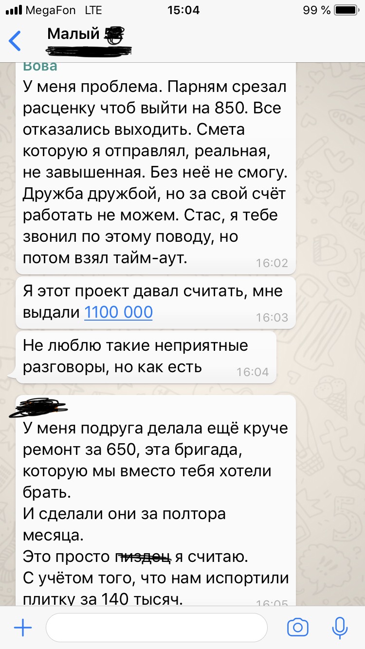 Сделали дизайн проект квартиры (двушка 66 метров) и начали искать ремонтников. Обратились в компанию АТЕКТ к прорабу Владимиру Мякушину. Договорились на работы под ключ за 800 000 руб. До этого был сделан дизайн проект. Срок обсуждали 3 месяца. По ходу ремонта новых работ не появилось, наоборот отказались от дорогих гипрочных потолков в пользу натяжных. Началось все очень бодро, когда мы уже перевили порядка 600 тысяч и попросили прислать Итоговую цену (думали она уменьшится из-за потолков) нам прислали цену 950 000 руб. Пояснить увеличение цены не смогли и в итоге «сторговались» на 850 000 руб. Мы перевели ещё 100 000 руб. И работы практически встали, постоянно кто-то болел из ремонтников, кто то перестал выходить на связь, прораб Владимир не отвечал на письма, нам зачем то дорогую плитку в ванной положили вертикально (при высоте потолков в 3 метра). Это при том, что все материалы мы покупали в срок и не задержали оплату ни на один день. Дальше было ещё хуже, испортив нам потолочный плинтус, ламинат, плитку и не доделав даже черновые работы нам пришло сообщение (скрин во вложении) что за эти деньги доделать невозможно и нужно все таки 950 000 тысяч, а по хорошему 1 100 000 руб. Все подтверждения в фотографиях. Если хотите дорогой долгий и некачественный ремонт обращайтесь к Мякушину Владимиру в фирму Атект СПБ
