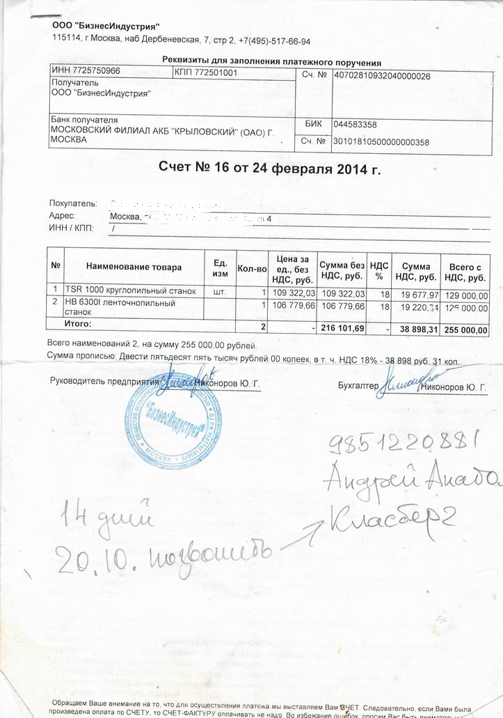 Суть проблемы. Я в (Хай Поинт, но по документам называется иначе) ООО Бизнес Индустрия (расположенного по физическому адресу: Адрес: 141400, Россия, Московская область, Химки, ул. Ленинградская, д. 1 и юрадрес 115114 Москва Дербеневская наб. д.7 стр.2 тел. +7495-5176694) оплатил наличными 2 станка 255 000руб. Круглопильный TSR 1000 за 129 000руб и ленточнопильный НВ 6300 за 126 000руб. Круглопильный я забрал 24.02.2014г. (накладная №16 от 24.02.2014г.) Ленточнопильный я ждал более 6месяцев и не дождался. Я забрал станок, 15.09.2014г. (накладная №1092 от 15.09.2014г.) который был у них в наличии. Это был ленточнопильный станок НВ 4300 и он был дешевле мною заказанного на 60 113руб. Размер их задолженности перед мною составляет 60 113 рублей. Они не отдают деньги. Козлы редкие. Одного козла зовут Вильбовец Дмитрий Валерьевич (это типа менагер)тел.+79175165883, а второго козла зовут Класберг Андрей Анатольевич(это типа главный менагер) тел +79851220881 Да и станки, которые они продают, полное г**но. Это уже личный опыт использования. Не давайте своих (трудно заработанных)денег этим моральным уродам.