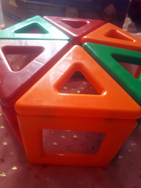 Магнитный конструктор Магникон мы купили, когда дочери было одиннадцать месяцев. Сейчас малышке почти полтора года, и Магникоша+ по-прежнему остается одной из ее любимых игрушек. Прежде наша девочка только либо наблюдала, как я или старший брат строим из деталей различные поделки, либо с большим энтузиазмом их разбирала. Сейчас малышка уже научилась самостоятельно собирать простенькие конструкции. Не так ровно, конечно, как на фото, это я слегка подправила домики. Она знает, какая из фигур квадрат, а какая треугольник, хотя назвать их правильно пока не умеет, не выговаривает. Достаточно уверенно дочурка берет пальчиками и подает мне деталь определенного цвета, умеет собрать в кучку только желтые или зеленые блоки. И все это мы выучили и продолжаем учить с помощью Магникоши+. Наверное, кто-то удивится, услышав, что я купила одиннадцатимесячному младенцу магнитный конструктор. Объясняю – я выбрала набор МК-16, который и выпускается для самых маленьких деток, 0+. В нем все хорошо продуманно – элементов немного, всего 16 штук, сделаны они из очень твердого цветного пластика. Блоки крупные, объемные, с закругленными гранями и углами. Каждый из них тщательно обработан, ни шершавинки на поверхности не чувствуется, когда проводишь пальцами. Магниты находятся внутри, в недоступном месте, и опасности не представляют. Их просто невозможно извлечь, не разломав фигуру, а это задача для малыша невыполнимая. Качество у Магникон отличное, если не знать, что это аналог дорого конструктора, даже в голову такая мысль не придет. Замечательная игрушка, я ее рекомендую