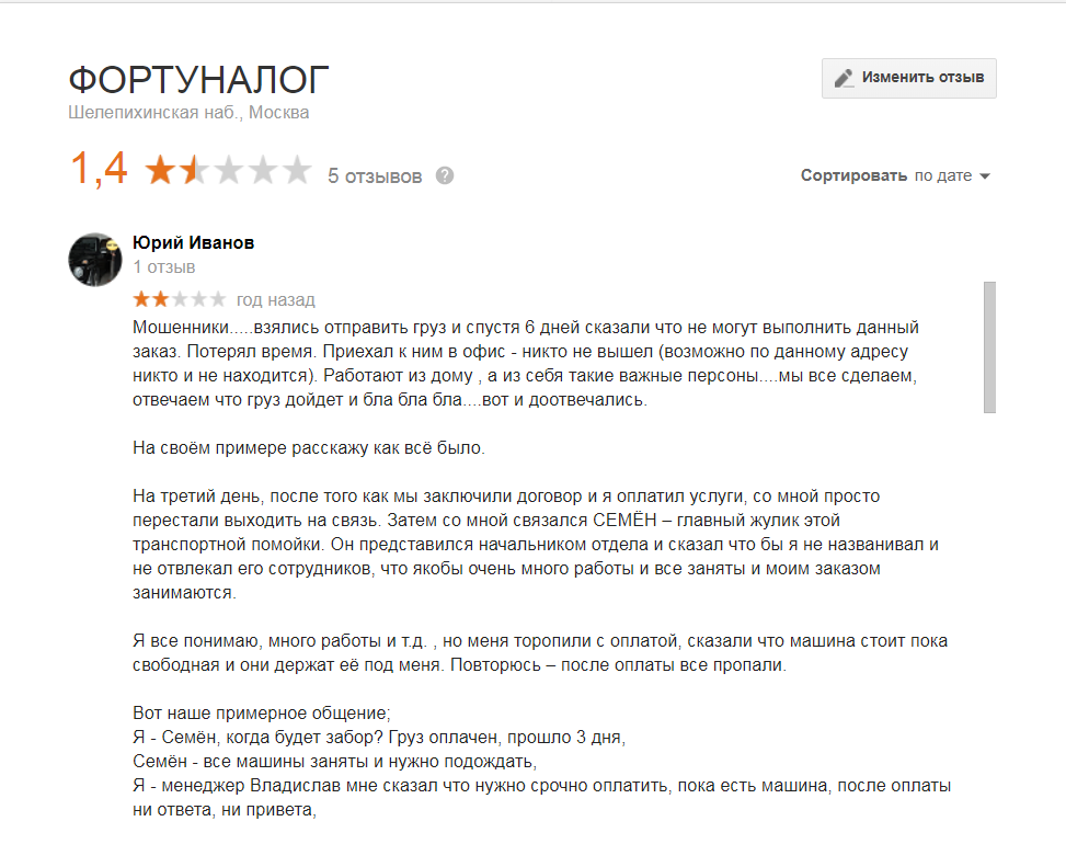 Мы договорились с Пардиловым Сиюн Сергеевичем (ИНН 771889222728) который представлялся владельцем и директором Фортуналог на перевозку детских вещей и игрушек из Германии в Россию, заплатили лично ему на его личную карту 130.000 рублей, Пардилов Сиюн нашёл перевозчиков из Белоруссии и дал им заказ, когда груз приехал в Москву, он кинул перевозчиков и не заплатил им, также начал вымогать с нас ещё 50.000 рублей, перевозчики не отдавали нам груз без оплаты, в итоге нам пришлось заплатить перевозчикам ещё 75.000 рублей банковским переводом, и после этого мы 130.000 от Пардилова Сиюна обратно не получили, так как он деньги в Фортуналог не внёс, а потратил на себя. Мы выиграли суд против фортуналог, суд решил взыскать с них деньги, но так как Пардилов Сиюн никогда деньги на счёт не вносил, не только наши но и другие заказы, то ФНС фирму ликвидировали из-за фальшивых данных при регистрации. Вот и вся история. 134 фирмы однодневки с годовым оборотом более 100 миллионов рублей обманывают россиян на грузоперевозках! Есть все документы. Полиция не возбуждает дело ибо нет заявления от ФНС, ФНС не подаёт заявление ибо нет налоговой отчётности, значит нет и долгов по налогам. Обманутые граждане теряют ежегодно миллионы, получают решения судов и не могут вернуть деньги ибо фирмы ликвидирует ФНС как однодневки. Группа граждан России совместно более 20 лет создают фирмы однодневки якобы для грузоперевозок, всё на одном и том же работающем интернет сайте, в итоге получают заказы либо от иностранцев либо от россиян, собирают деньги переводами на личные карты в Сбербанке России и в дальнейшем грузоперевозки не оказывают, полиция не принимает заявление как гражданско — правовые отношения, а фирмы ежегодно банкротятся и создаются новые. ИНН всех фирм однодневок могу предоставить. Последняя фирма в 2021 году собрала с граждан 3,1 миллиона рублей, в 2022 году ещё 57 миллионов рублей…И после сбора средств ежегодно фирмы бросают, их ликвидирует сама налоговая за непредоставление отчётности и тут же параллельно создаются новые с тем же названием до буквы, но новым ИНН и процесс продолжается дальше. Последняя фирма ИНН 7734443023 ФОРТУНАЛОГ СИА ЛАЙНС Учредитель Пардилов Сиюн Сергеевич ИНН 771889222728, он Пардилов Сиюн лично от нас получил 130.000 рублей и присвоих их себе, не внеся на счёт фирмы в банке. Мы лично пострадали от этой однодневки на 130.000 рублей, выиграли против них дело в Басманном суде Москвы, получили решение и не получили ни копейки обратно. Братья однодневки — фирмы зомби Ликвидированные ФНС в 2022 ООО «ФОРТУНАЛОГ» ИНН 7729772061 Ликвидированные ФНС в 2020 ООО «ФОРТУНАЛОГ» ИНН 7729683460 Действующие ещё пока ЗОМБИ-ОДНОДНЕВКИ ООО «ФОРТУНАЛОГ ЭЙР ЛАЙНС» ИНН 7743301240 ООО «ФОРТУНАЛОГ СИА ЛАЙНС» ИНН 7734443023 И ещё 130 фирм с общими учредителями как выше. Главарь всего этого сообщества — Пардилов Сиюн Сергеевич, ИНН 771889222728 Их сайты «fortunalog. ru» «gruzoperevozki-rf. ru»