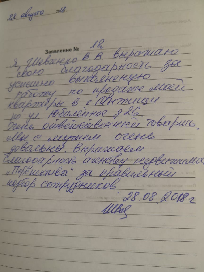 Я, Шевченко В. В., выражаю свою благодарность за успешно выполненную работу по продаже моей квартиры в г. Мытищи по ул. Юбилейная, д. 26. Очень ответственный товарищ (Будашев А). Мы с мужем очень довольны. Выражаем благодарность агентству недвижимости "Перспектива 24" за правильный подбор сотрудников. Шевченко Валентина Владимировна