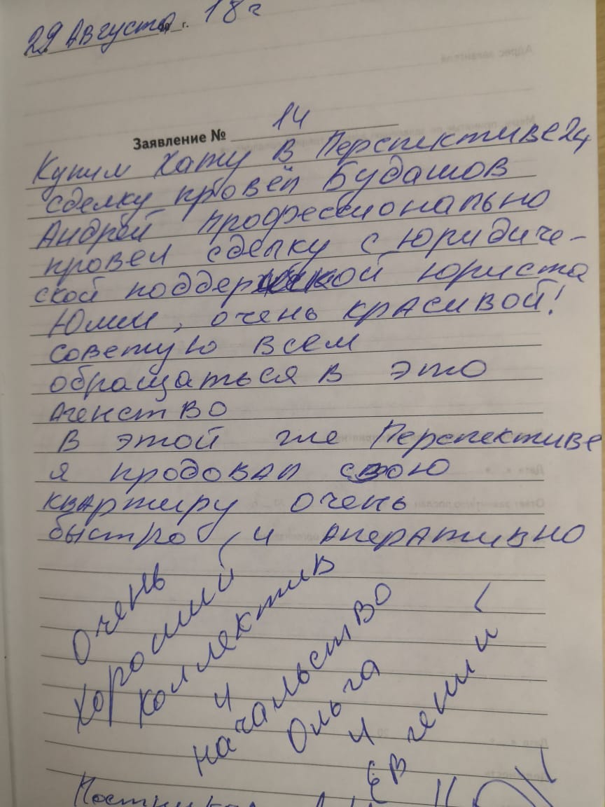 Купил хату в Перспектива 24 сделку провел Будашев Андрей профессионально провел сделку с юридической поддержкой юриста Юлии, очень красивой! Советую всем обращаться в это агенство. В этой же Перспективе я продавал свою квартиру очень быстро и оперативно! Очень хороший коллектив и начальство Ольга и Евгений. Постников А.Н.