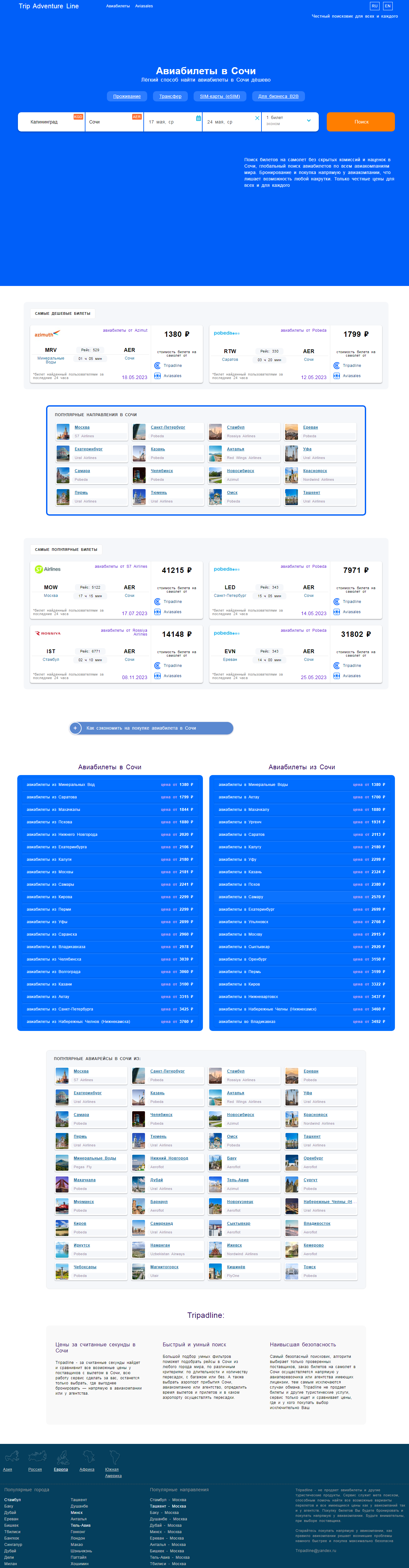 Недавно искала билеты на самолет, наткнулась на tripadline, ну в целом сайт достаточно приятный, хотя очень похож на aviasales но визуально удобнее, быстрее и круче. Кто знает может он им и принадлежит, но не суть. Достаточно быстро нашли с сестрой билеты в Сочи, цены чуть дешевле чем везде, в целом поисковик не обманывает, заказывали через победу, цены что на tripadline что у победы абсолютно одинаковы, думали заказать через alfa travel но ,дика удивилась, вроде цивильные ребята, а цена практически на целую тысячу больше чем у авиакомпании, остановились на tripadline. Проверить или опровергнуть мои слова, легко, просто сравните цены и все станет ясно. Удобен, приятен, и что самое главное оооочень быстрый. Нам понравился, да и на рынке давно вроде уже он, тоже не маловажный факт!!! Чем пользоваться, выбор каждого, мне лично понравился, хотя я дикая привереда.