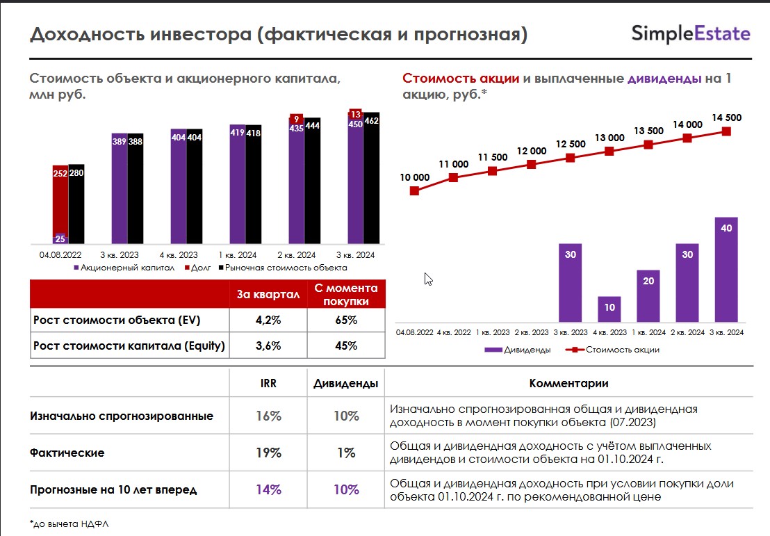 У меня капитал инвестирован в 2 объекта SimpleEstate. Первый в Орехово-Зуево, арендатор – Пятерочка. Рост стоимости недвижимости 28% (куплен объект в 2020 году), дивиденды - 9% годовых. Второй объект в строящемся ЖК «Новое Летово». Выводы пока рано делать, но прогнозируется доход в 19-46%. Даже 19% посчитаю достойным результатом, но я склоняюсь к тому, что доход будет ближе к максимальному прогнозу. Есть уже и первые договоренности с арендаторами, так что рассчитываю через пару лет получить отличный доход с продажи своей доли.