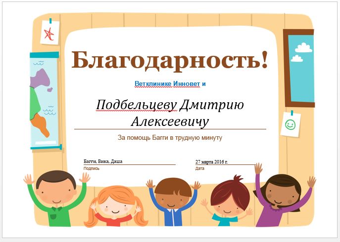 Наконец то дошли руки написать, как говорится. Я уже писала 22.10.15, что наша Багги сломала лапку и Дмитрий Алексеевич нас оперировал повторно, первую операцию неудачно провели в другой клинике. Так вот, сообщаю, что наша малышка себя чувствует отлично, все срослось ровно, металлическую конструкцию давно сняли, все зажило. Еще раз хочется выразить признательность и сказать спасибо Подбельцеву за умелые руки и доброе сердце. Мы ооооочень Вам благодарны! P.S. Ребенок Вам сделал открытку, попробую прикрепить.