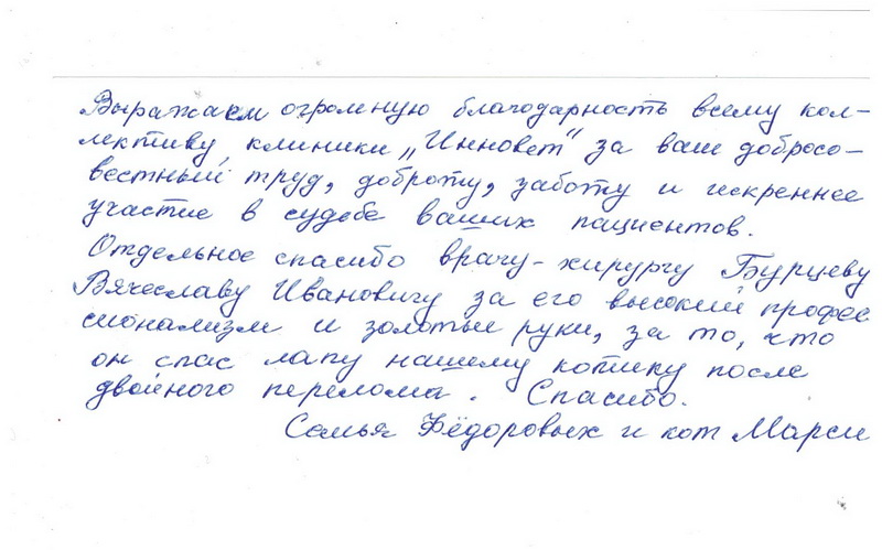 Хочу сказать спасибо и выразить свою благодарность коллективу ветклиники ИННОВЕТ за чуткость, профессионализм и доброту! Особую благодарность хочу выразить Подбельцеву Д. А. У нас в городе мы не имеем достаточно возможности оперировать сложных, тяжело больных животных. С 2009 года часто отправляем переломанных маленьких пациентов именно в ИННОВЕТ, где нам всегда помогали и все животные после операции восстанавливались и сейчас прекрасно себя чувствуют. Вот и сегодня мы забрали Котенка, которого двумя днями ранее привезли в ИННОВЕТ с компрессионным переломом позвоночника. Котейка чувствует себя замечательно, надеемся на скорое восстановление. Огромное СПАСИБО хирургу Подбельцеву Д. А. и Бурцеву В. И. за Ваш профессионализм, теплоту и доброту!