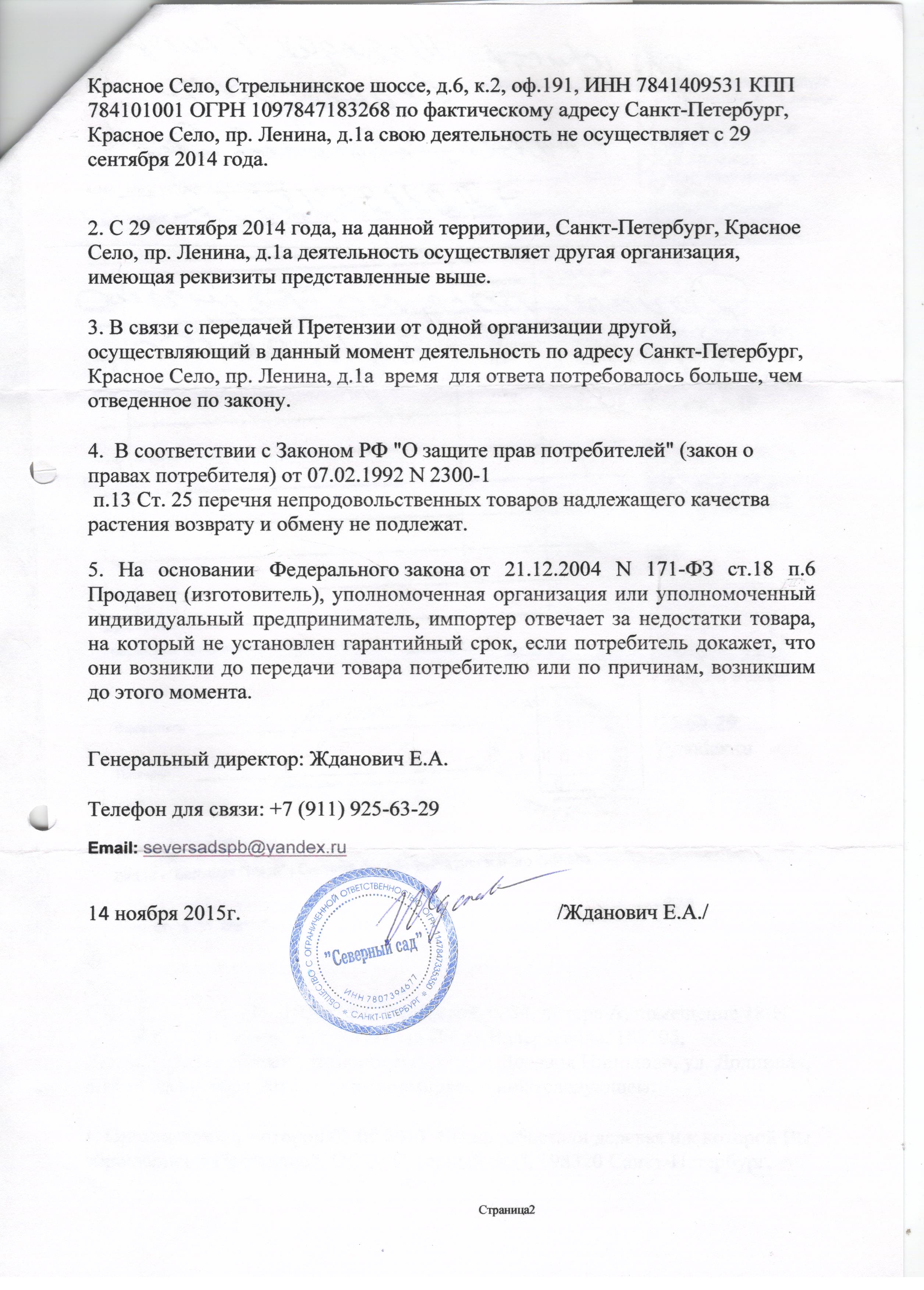 Уважаемый Мяндин Павел! ООО «Северный Сад», в ответ на все ваши отзывы на просторе интернета, поясняет вам и всем тем, кого вы вводите в заблуждение: ООО «Северный Сад», генеральным директором которого на тот момент был Мальков Р.В., осенью 2013 года реализовал и посадил декоративные деревья по адресу: Ленинградская область, Ломоносовский район, коттеджный поселок «Австрийская деревня». Место посадки вдоль дороги общего значения. Еще раз обращаем внимание - вдоль дороги общего значения, т.е. с интенсивным движением, чисткой и обработкой дороги в зимний период! Место посадки выбрано исключительно заказчиком, т.е Павлом Мяндиным. Время посадки - осень 2013 года. Договора по уходу за посадками, как понимаем из отзывов, заключено не было. В 2014 году весной все деревья проснулись, были живыми и здоровыми до зимы. Весь сезон 2014 года Павел ухаживал (или не ухаживал) за молодыми посадками. Только в 2015 году, и в 2016 году деревья стали гибнуть. И Павел, как понимаем, снова не обращается к специалистам, а самостоятельно ухаживает (или не ухаживает) за своими посадками. Даже если бы Павлом была оформлена гарантия на посадки, она бы действовала ровно 12 месяцев, т.е до осени 2014 года. С его слов так и произошло, что и без оформления гарантии, молодые посадки не погибли и не утратили декоративности даже частично, находясь в сложных придорожных условиях. С осени 2014 года, ваши растения - зона вашей ответственности. А учитывая, что деревья у вас гибнут каждый год есть проблемы с пониманием ухода за деревьями, и возможно, присутствуют другие и факторы как «добрые соседи», близость дороги и т.д. - ни в одном случае ООО «Северный Сад» ответственности не несет. Вы получили отказ необоснованных требований по замене растений не только от нашей компании, которая не имеет отношения к вашим растениям, но и от Роспотребнадзора, который так же счел ваши требования неправомерными, и ответ которого вы публиковать не стали. На момент вашего требования и по сей день, по адресу: СПб,г. Красное Село, пр. Ленина 1 лит «А», с 29.09.2014 года осуществляет свою деятельность ООО «Северный Сад» ИНН: 7807394677 КПП: 780701001 Адрес: 198259, г Санкт-Петербург, ул Тамбасова, д 34, Литера А, пом. 18-Н. Генеральный директор Жданович Елена Анатольевна, о чем информирует и запись на щите информации по фактическому адресу. До 29.09.2014 года, по адресу: СПб,г. Красное Село, пр. Ленина 1 лит «А» осуществлял деятельность ООО «Северный Сад» ИНН: 7841409531 КПП: 780701001 Адрес: 198320 г Санкт-Петербург, г Красное Село, ш Стрельнинское, 6 / 2, оф 191. Генеральный директор Мальков Роман Викторович И здесь нет ни какого обмана. P.S. Уважаемый Павел. ООО «Северный Сад» настоятельно рекомендует не вводить в заблуждение тех, кто читает ваши отзывы, а всю мощь своей энергии пустить в мирное русло - подробнее изучить вопрос ухода за растениями, во избежание дальнейшей их гибели. В случае необходимости можете обратиться за консультацией к специалистам ООО «Северный Сад»