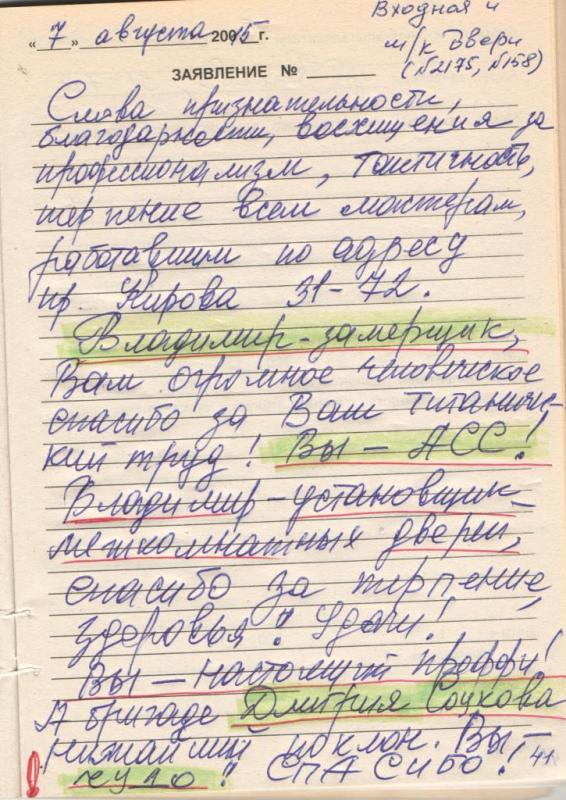 Заказывала входную и межкомнатные двери в этой компании, договора № 2175, № 158. Слова признательности, благодарности, восхищения за профессионализм, тактичность, терпение всем мастерам, работавшим по адресу пр. Кирова 31. Владимир - замерщик, Вам огромное человеческое спасибо за Ваш титанический труд! Вы асс! Владимир - установщик межкомнатных дверей, спасибо за терпение. Здоровья и удачи! Вы настоящий профи! А бригаде Дмитрия Соцкова нижайший поклон! Вы чудо! Спасибо!