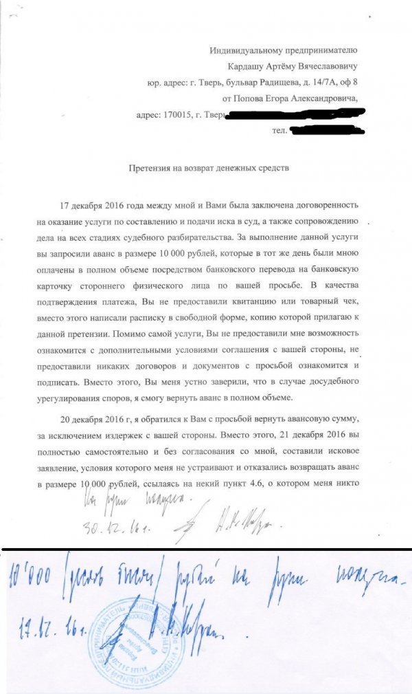 Я, Попов Егор Александрович, имел неосторожность посетить данную организацию 16 декабря 2017 г. По результатам крайне не рекомендую повторять моих ошибок и ни в коем случае не обращаться к Кардашу А.В. за помощью в юридических вопросах. На моем примере, Кардаш А.В. запросил аванс в размере 10 000 рублей, взяв на себя обязательство составить исковое заявление и выступить в качестве доверителя на всех стадиях судебного разбирательства по моему иску. Как только мною была выплачена вся сумма, Кардаш А. В. резко изменился в поведении, начал откровенно нагло себя вести и хамить. А после и вовсе перестал отвечать на мои звонки(при этом успешно брал трубку с других номеров), не выполнив абсолютно никакой работы, на которую мы договаривались. Мне удалось его выманить только через подставное лицо, чтобы вручить претензию, которую прикрепляю к данному отзыву. Далее, Кардаш А.В. не посчитал нужным в установленные законом сроки отреагировать на претензию, точно так же как и вернуть деньги за не сделанную работу. Более того, по телефону г. Кардаш в наглой хамской манере, прямым текстом заявил «вас кинули строители, теперь вас кинул я». Это высказывание записано на диктофон и будет предоставлено мною по первому требованию. Стоит отметить, что Кардаш А.В. не стесняется в выражениях ведя деловую переписку. Всем рассказывает как его очерняют в интернете. Это конечно не правда. Данный отзыв персонифицирован и каждый может обратиться ко мне в соц сетях или по почте за разъяснениями. От себя лично рекомендую поискать юриста с более чистой репутацией).