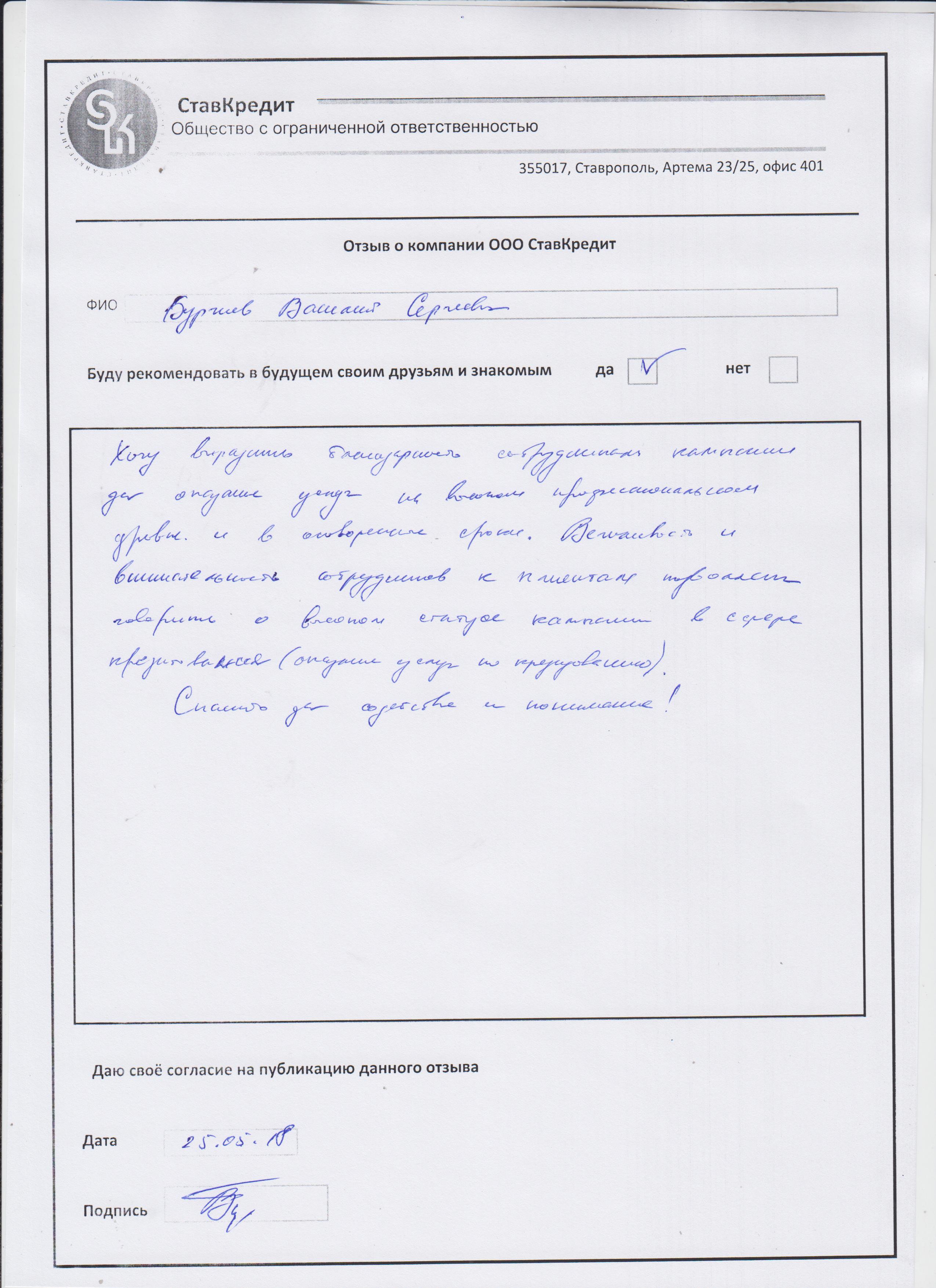 Письменный отзыв клиента компанией «Ставкредит». Обращаем Ваше внимание, клиент дал согласие на публикацию данного отзыва. Отзыв является подлинным, при обращении в офис нашей компании, руководитель офиса предоставит по первому требованию оригинал отзыва. г. Ставрополь, ул. Артёма, 23 , 401 офис +7 (8652) 99-00-48