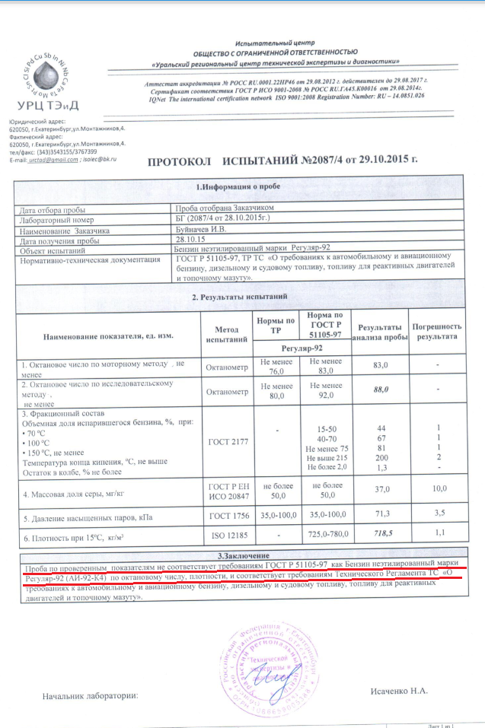 В октябре 2015 года купили у данной компании 92-ой бензин в договоре и спецификации написали что нефтепродукты должны соответствовать ГОСТу и экологическому классу Евро-5. Сделку вёл менеджер Рустэм, он заверил что машина будет грузится на "Черкасах". В результате по факту прихода автомобиля была отобрана проба которая была отдана на анализ в сертифицированную лабораторию. По результату исследований было выдано заключение, что данная проба не соответствует требованиям ГОСТ по плотности, октановому числу. По истечении суток продукт РАССЛОИЛСЯ!!! На данный момент по истечении 2ух месяцев сотрудники данной компании уклоняются от ответа отказываясь заменить или осуществить возврат денег. Данная компания является недобросовестным поставщиком, руководство компании в лице Учредителей Псышаница Степан, Суфиянова Эльза, генерального директора Суфиянова Эльза, исполнительного директора Бикбулатова Азата, менеджера Рустэма перекладывают ответственность за данный инцидент друг на друга. При этом дают обещания что завтра перезвонят, обманным путем пытаются склонить к подписанию документов о приемке товара, что якобы после подписания решат вопрос о замене товара. При работе с данной компанией БУДЬТЕ ОСТОРОЖНЫ! не сливайте нефтепродукты до того как получите заключение аккредитованной лаборатории и не в коем случае не переводите предоплату!